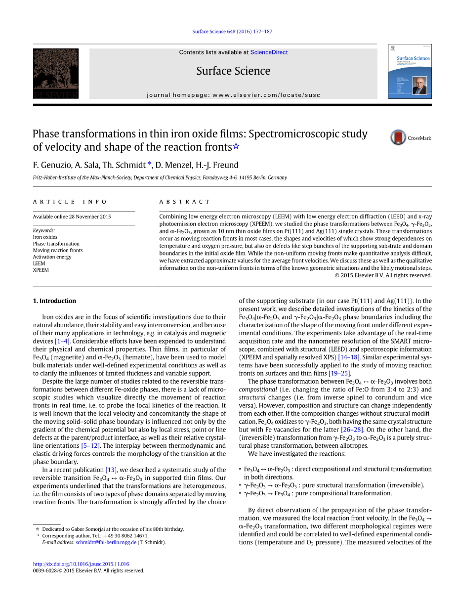 结合低能电子显微镜(LEEM)与低能电子衍射(LEED)和x射线我们研究了在Pt(111)和Ag(111)单晶上生长为10nm薄氧化膜的Fe3O4,gamma;-Fe2O3和alpha;-Fe2O3之间的相变。 这些转变在大多数情况下,其形状和速度显示出对温度和氧气压力的强烈依赖性,而且在初始氧化膜中的支撑衬底和畴边界的阶段束之类的缺陷上发生。 虽然向前的非均匀移动使定量分析困难,但是我们提取了平均前向速度的近似值。 我们在已知的几何情况和可能的运动步骤方面讨论这些以及关于非均匀前沿的定性信息。