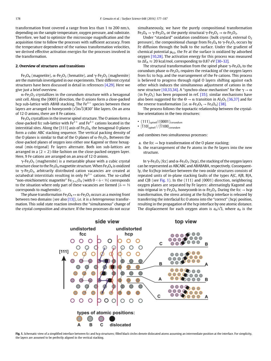 在gamma;-Fe2O3(fcc)和alpha;-Fe2O3(hcp)中,氧层的堆叠可以分别表示为ABCABC和ABABABA。 因此,两个氧化物结构之间的fcc | hcp接口由A | C,A | B,B | A和C | B类型的重复单位的面内堆垛层错构成(见图1)。 在(111)和(0001)方向上,相邻的氧平面被Fe层分离:在gamma;-Fe2O3,蜂窝状alpha;-Fe2O3中交替地使用Kagomeacute;和混合三角。 在fcc→hcp转换期间,通过将界面fcc O原子转移到“正确”(hcp)位置,释放fcc | hcp接口产生的应力,导致hcp接口传播一个原子距离。位移 对于每个氧原子是a0 /radic;3,其中a0是未变形O层的原子间O-O距离; 位移的方向是消除平面堆垛层错的方向(图1)