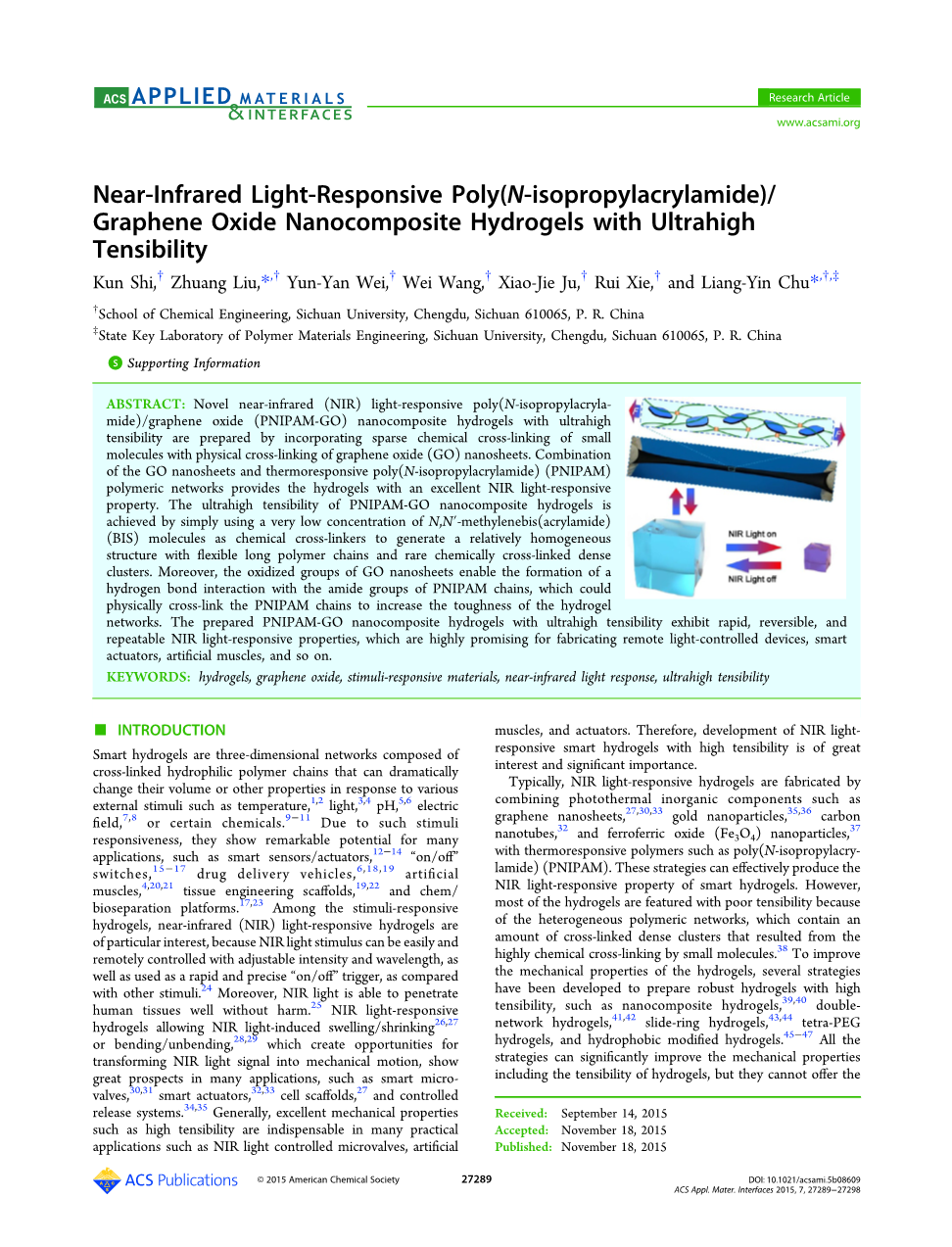 关键词:水凝胶,氧化石墨烯,刺激响应材料,近红外光响应,超高张力