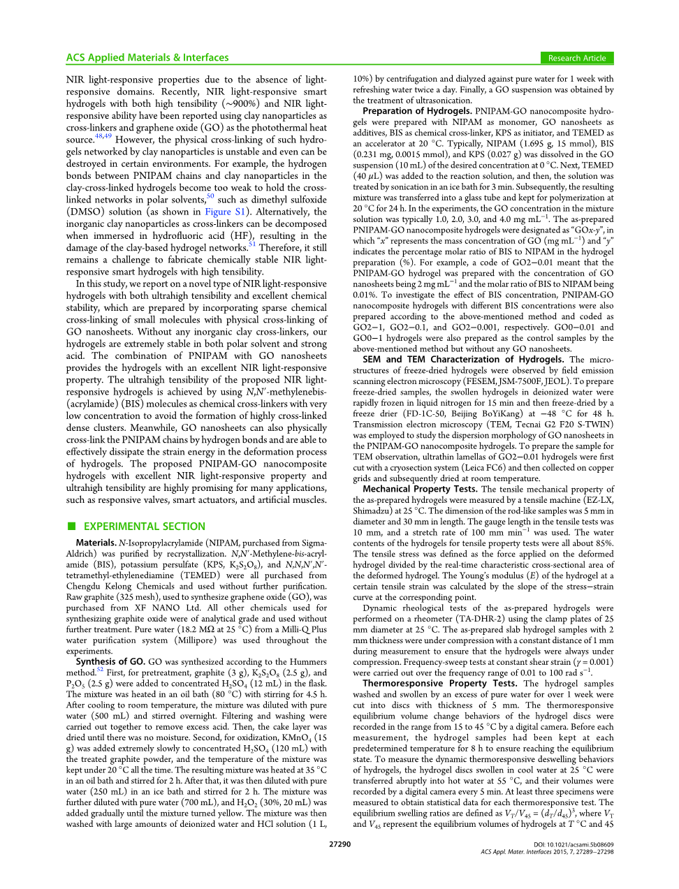 水凝胶的制备。以N-异丙基丙烯酰胺为单体,GO纳米片作为添加剂,BIS作为化学交联剂,KPS作为引发剂,TEMED作为促进剂在20℃下制备N-异丙基丙烯酰胺-GO纳米复合水凝胶。通常,将N-异丙基丙烯酰胺(1.695g,15mmol),BIS(0.231mg,0.0015mmol)和KPS(0.027g)溶于0℃的所需浓度的GO悬浮液(10mL)中。接着,将TEMED(40mu;L)加入到反应溶液中,然后将溶液在25℃下用溶液处理3分钟。随后将所得混合物转移到玻璃管中并在20℃下保持聚合24小时。在实验中,GO浓度混合物溶液典型地为1.0,2.0 ,3.0和4.0毫克毫升。 所制备的N-异丙基丙烯酰胺-GO纳米复合水凝胶被设计为“GOx-y”,其中“x”代表GO的质量浓度(mg mL-1),“y”代表水凝胶制剂中BIS与NIPAM的百分比摩尔比(%)。。例如,代码为GO2-0.01意味着制备的N-异丙基丙烯酰胺-GO水凝胶的GO纳米片的浓度为2mg mL-1,且BIS对N-异丙基丙烯酰胺-的摩尔比为0.01%。为了研究BIS浓度的影响,还按照上述方法制备了具有不同BIS浓度的N-异丙基丙烯酰胺-GO纳米复合水凝胶,分别编码为GO2-1,GO2-0.1和GO2-0.001。还通过上述方法制备了GO0-0.01和GO0-1水凝胶作为对照样品,但没有任何GO纳米片。