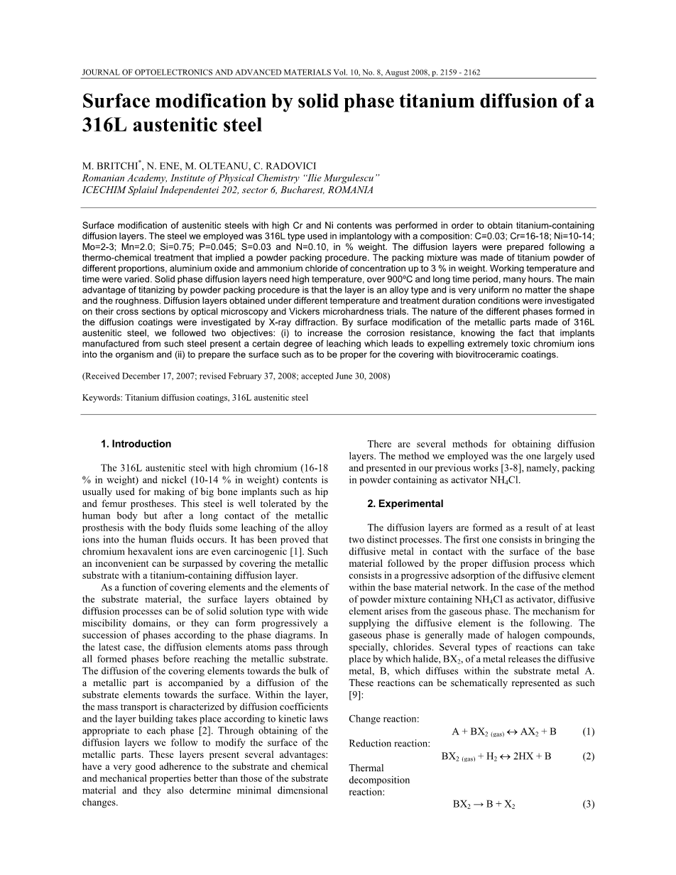 Mn=2.0;Si=0.75;P=0.045;S=0.03和N = 0.10。粉末的热化学处理过程进行之后扩散层形成。这个填充混合物是由不同比例的钛粉、氧化铝以及浓度达到总重3%的氯化铵组成。工作温度和时间可以变化,固相扩散层需要900℃以上高温并加热好几个小时,通过粉末法渗钛的主要优点是渗层是合金化类型并且不论是形状或是粗糙度都十分均匀。在不同温度和处理持续时间条件下所获得的扩散层,通过光学显微镜和维氏显微硬度试验研究了它的横截面。在扩散涂层里形成不同相的特性可以通过X射线衍射来研究。316L奥氏体钢制成的金属部分的表面改性,我们追求两个目标:为了提高耐蚀性,我们都知道从这样的钢中产生的移植物代表着某种程度的浸出,这个会导致排出剧毒铬离子进入生物体和为了准备适合生物陶瓷覆盖涂层的表面。