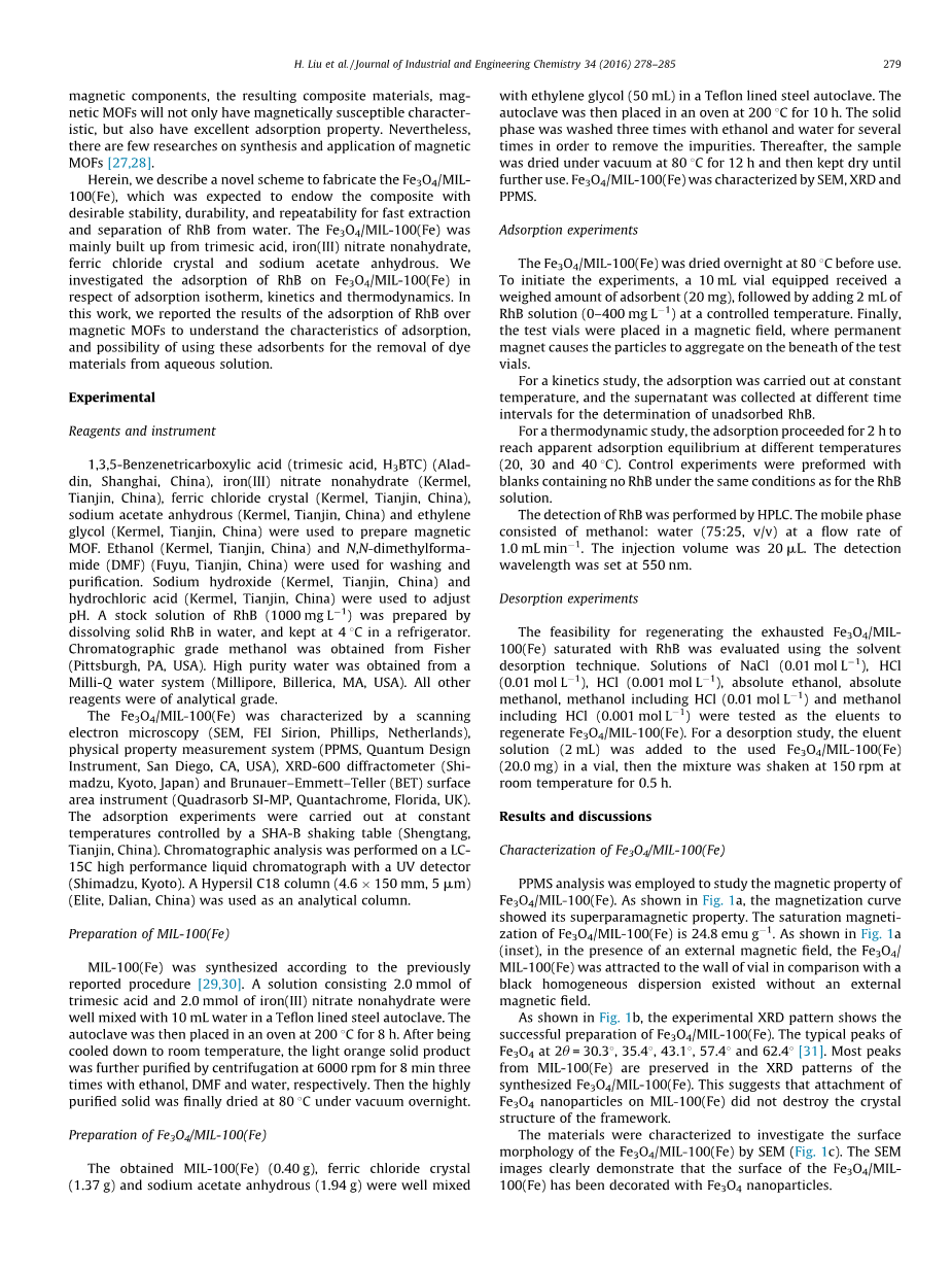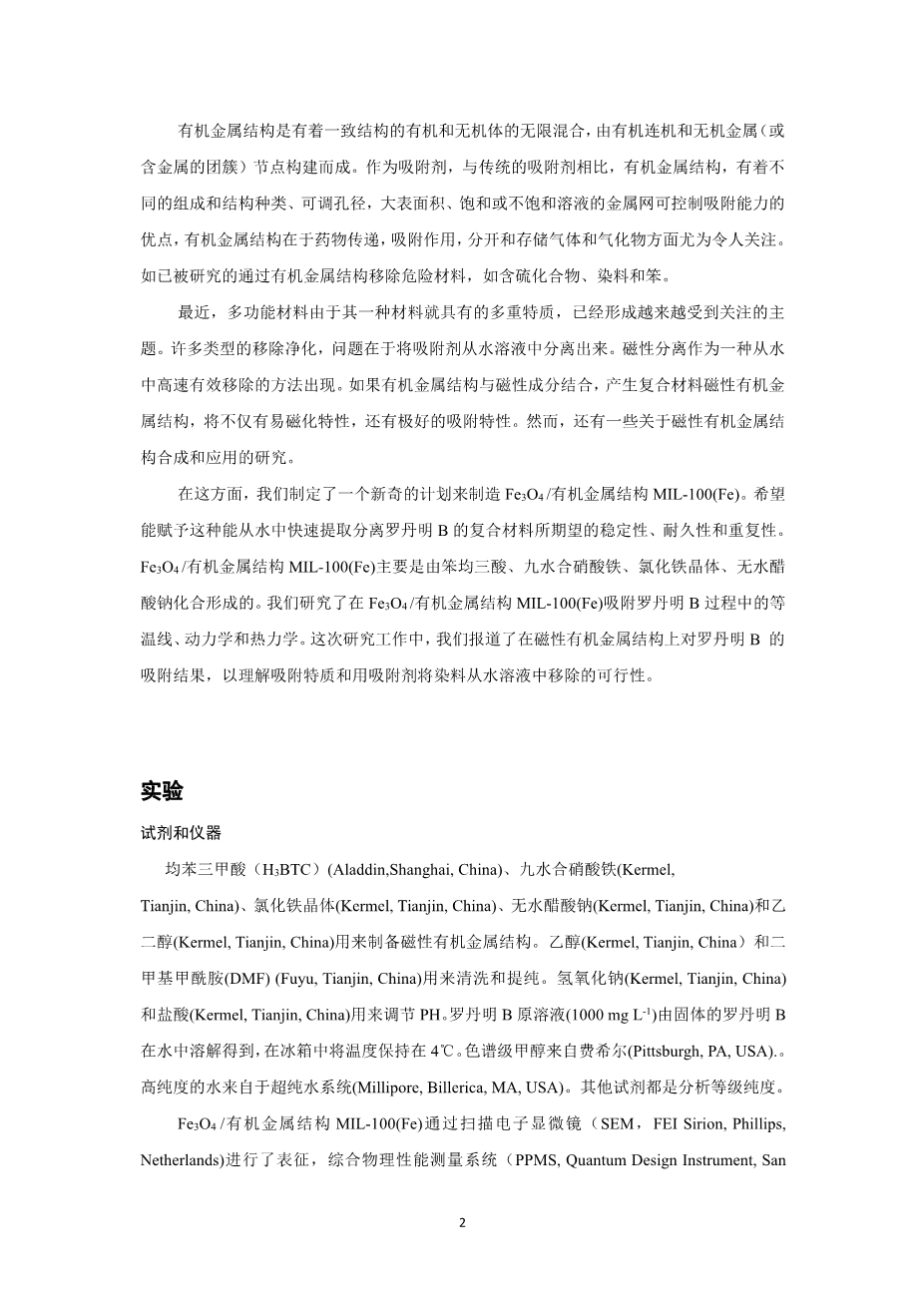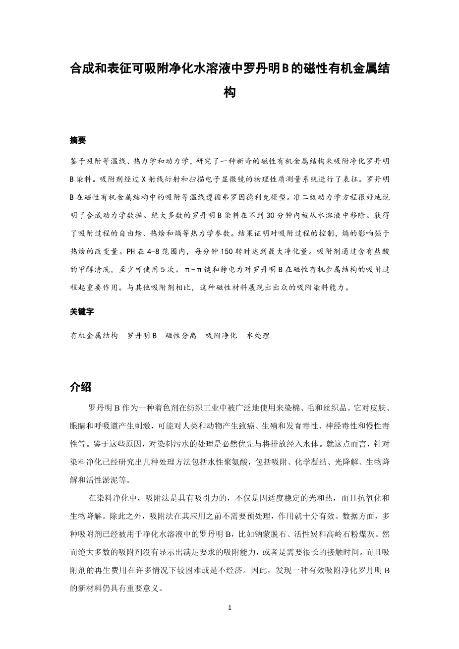 - 合成和表征可吸附净化水溶液中罗丹明B的磁性有机金属结 构外文翻译资料