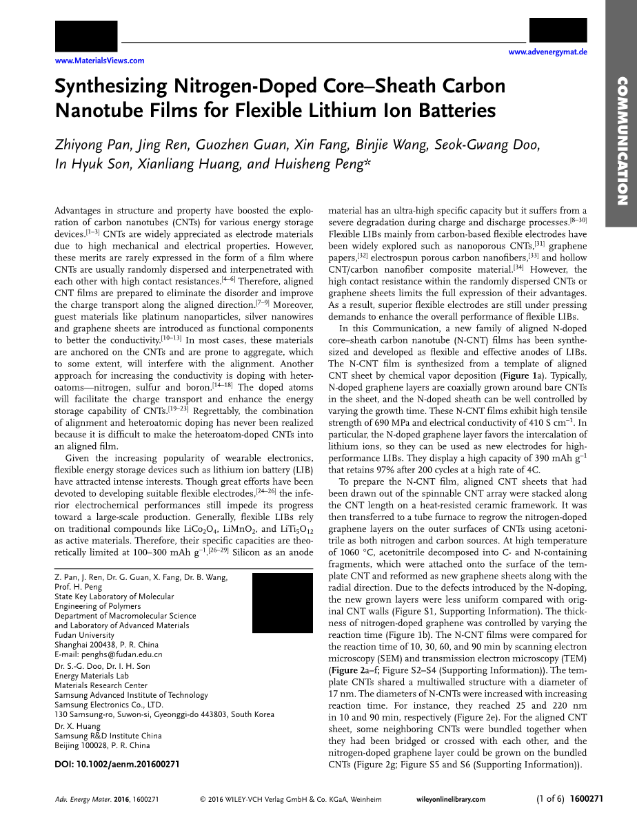 Zhiyong Pan, Jing Ren, Guozhen Guan, Xin Fang, Binjie Wang, Seok-Gwang Doo, In Hyuk Son, Xianliang Huang, and Huisheng Peng*