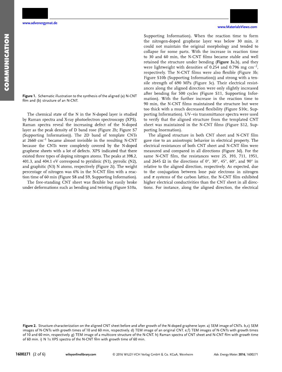 结构和性能上的优势促进了碳纳米管(CNTs)在各种能源存储设备中的应用中的研究。[1–3] 而且,CNTs因其具有高的机械和电化学性能作为电极材料被广泛赞赏。然而,这些优点是很少在薄膜里表现出来,因为CNTs通常是随机分散和以高接触电阻的形式连接。[ 4–6 ]因此,定向排列的碳纳米管薄膜被制备,以提高沿排列方向的电荷输运。[ 7–9 ]此外,像铂纳米颗粒,石墨烯,银纳米线这样的客体材料,因为其更好的导电性作为功能成分被引入体系以提高电导率。[10–13]但在大多数情况下,这些材料被固定在碳纳米管上因而易发生团聚,这在一定程度上会干扰纳米管定向排列。提高导电性的另一种方法是掺杂的氮、硫和硼。[14–18 ]掺杂原子,将有利于提高碳纳米管的电荷传输和储能能力。[19–23 ]令人遗憾的是,定向排列和杂原子掺杂的组合一直没有实现,因为很难用杂原子掺杂的碳纳米管制备取向膜。