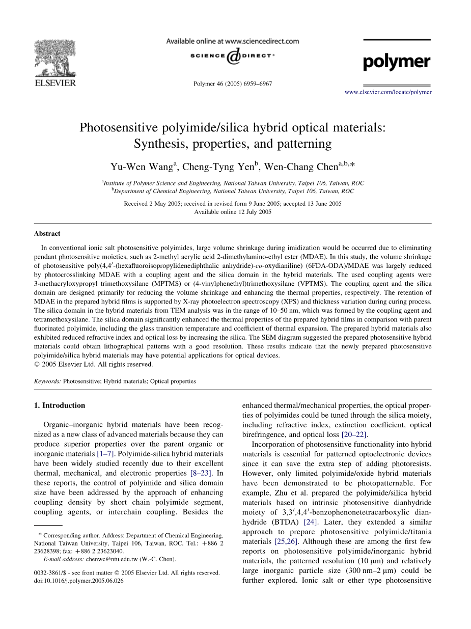 感光性聚酰亚胺/二氧化硅杂化光学材料:合成,性质和图案化