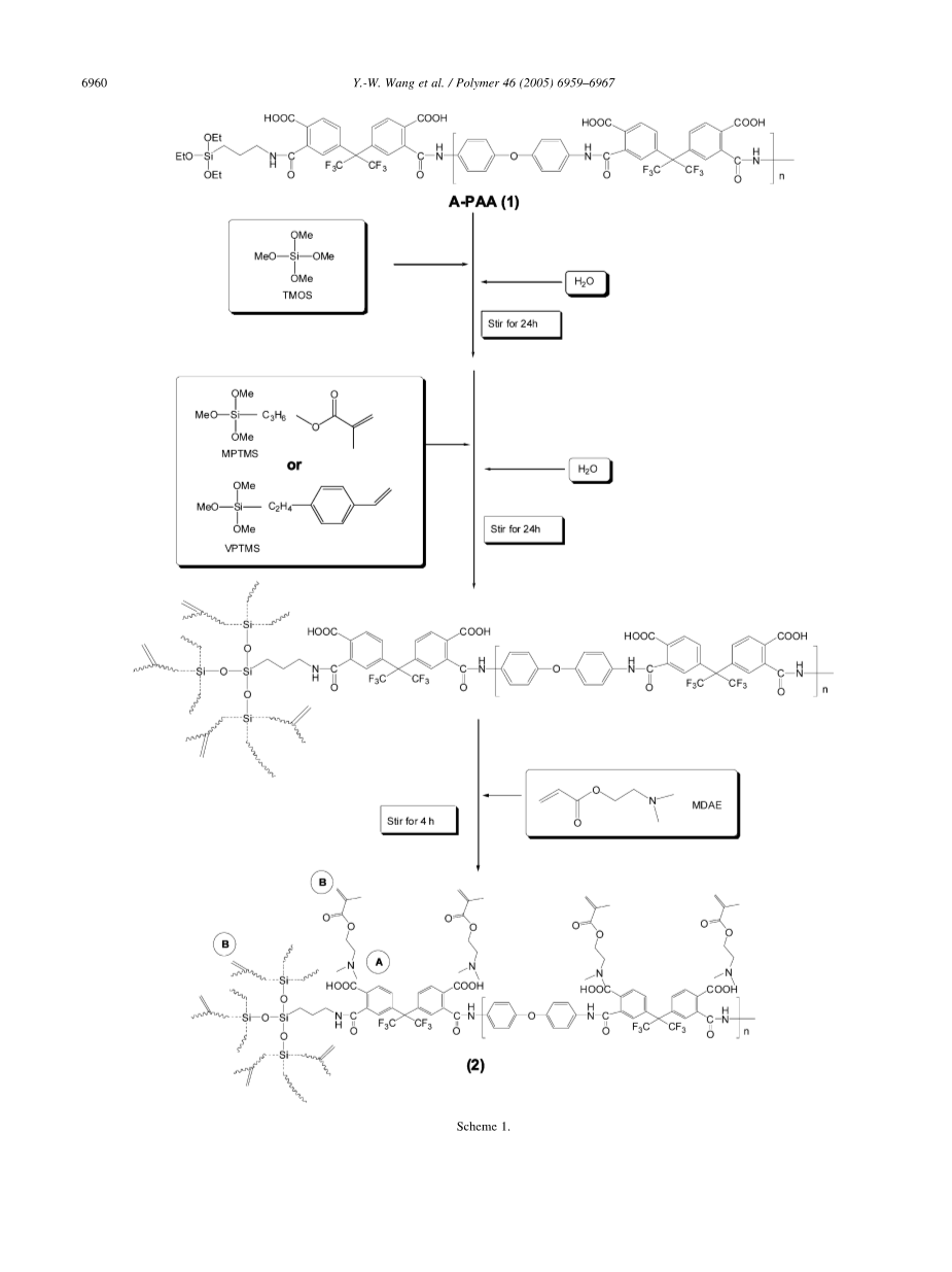 购买4,4-六氟异亚丙基二邻苯二甲酸酐(6FDA,兰开斯特,99%),并在120℃下减压脱水。购买氧化二苯胺(ODA,Acros,99%),通过升华纯化。 3-氨基丙基三乙氧基硅烷(APrTEOS,Aldrich,97%),2-甲基丙烯酸2-二甲基氨基乙酯(MDAE,Aldrich,98%),原硅酸四甲酯(TMOS,Aldrich,99%),3-甲基丙烯酰氧基丙基三甲氧基硅烷(MPTMS ,Aldrich,98%),4-乙烯基苯乙基三甲氧基硅烷(VPTMS,Gelest,99%)和N,N-二甲基乙酰胺(DMAc,Tedia,99%),不经纯化使用。光引发剂,双(2,4,6-三甲基苯甲酰基)苯基氧化膦(Irgacure-819)由台湾CIBA Geigy提供。