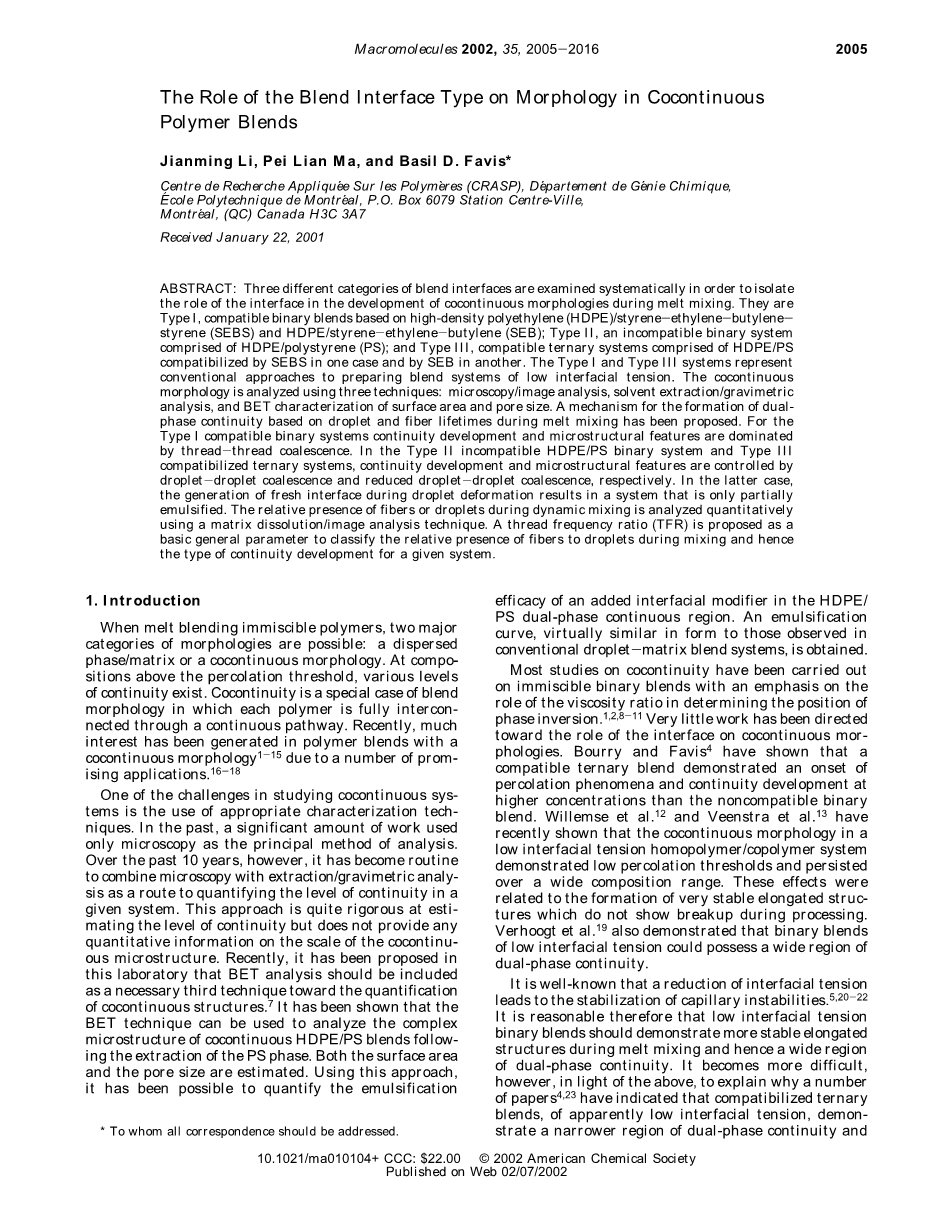 系统地检查了三种不同类型的混合界面,在熔体混合过程中隔离界面在共连续形态发展中的作用。它们是基于高密度聚乙烯(HDPE)/苯乙烯 - 乙烯 - 丁烯苯乙烯(SEBS)和HDPE /苯乙烯 - 乙烯 - 丁烯(SEB)的I型,相容二元共混物; II型,由HDPE /聚苯乙烯(PS)组成的不相容二元体系;和由SEBS在一种情况下由SEB增容的由HDPE / PS组成并且在另一种情况下由SEB增容的III型相容三元体系。 I型和III型系统代表制备低界面张力混合系统的常规方法。使用三种技术分析共连续形态:显微镜/图像分析,溶剂萃取/重量分析以及表面积和孔径的BET表征。已经提出了基于熔体混合过程中液滴和纤维寿命形成双相连续性的机制。对于I型兼容二进制系统,连续性开发和微结构特征主要由线程聚合组成。在II型不兼容的HDPE / PS二元体系和III型相容三元体系中,连续性发展和微观结构特征分别由液滴 - 液滴聚结和降低的液滴 - 液滴聚结来控制。在后一种情况下,液滴变形期间新鲜界面的产生导致仅部分乳化的系统。使用基质溶解/图像分析技术定量分析动态混合过程中纤维或液滴的相对存在。螺纹频率比(TFR)被提出作为基本的一般参数,用于分类混合过程中纤维与液滴的相对存在,并由此分析给定系统的连续性发展类型。