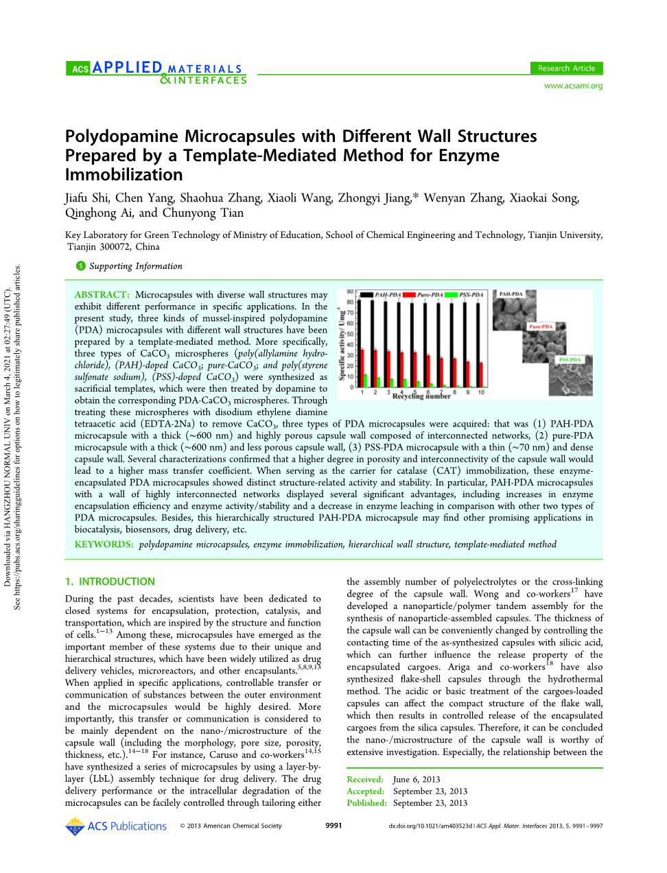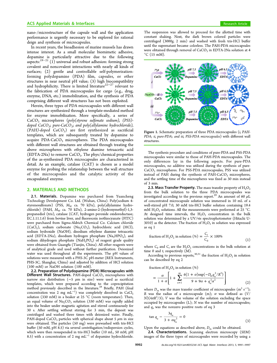 摘要:不同壁结构的微胶囊在特定的应用中表现出不同的性能。本研究采用模板介导的方法制备了三种不同壁结构的贻贝激发聚多巴胺(PDA)微胶囊。分别合成了三种类型的CaCO3微球(聚烯丙胺盐酸盐(PAH)掺杂CaCO3、纯CaCO3、聚苯乙烯磺酸钠(PSS)掺杂CaCO3)作为牺牲模板,通过多巴胺处理得到相应的PDA-CaCO3微球。用乙二胺四乙酸二钠(EDTA-2Na)处理这些微球去除碳酸钙,得到三种类型的PDA微胶囊:(1)具有厚(约600 nm)且囊壁致密的网状结构的PAH-PDA微胶囊,(2)具有厚(约600 nm)且囊壁致密的结构的纯PDA微胶囊,(3)具有薄(约70 nm)且囊壁致密的结构的PSS-PDA微胶囊。几个表征证实,更高的孔隙度和连通度的胶囊壁将导致更高的传质系数。作为过氧化氢酶(CAT)固定化载体,这些酶包被的PDA微胶囊具有明显的结构相关活性和稳定性。特别是,与其他两种PDA微胶囊相比,具有高度互联网络壁的PAH-PDA微胶囊表现出几个显著的优势,包括提高酶包封效率和酶活性或稳定性,降低酶浸出的概率。此外,这种分层结构的多环芳烃- PDA微胶囊在生物催化、生物传感器、药物传递等方面也有广阔的应用前景。
