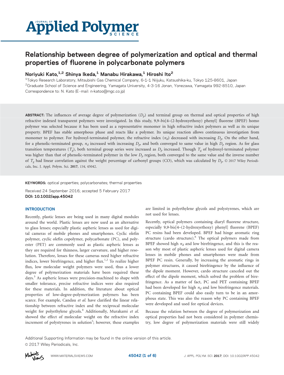 摘要:研究了平均聚合度和端基对高折射率透明聚合物热性能和光学性能的影响。本研究选用9,9-双[4-(2-羟基乙氧基)苯基]芴(BPEF)均聚物,因为它是高折射率聚合物中的代表性单体,并且具有独特的性质。BPEF具有稳定的无定形相,反应类似于聚合物。其独特的反应允许从单体到聚合物的连续研究。对于端羟基聚合物,折射率(nd)随着聚合度的增加而降低。另一方面,对于酚封端的基团,折射率随着聚合度的增加而增加,并且在高聚合度区域两者收敛到相同的值。至于玻璃化转变温度(Tg),两个端基系列都随着Dp的增加而增加。尽管在低聚合度区,端羟基聚合物的Tg高于端酚聚合物的Tg,但两者趋于相同的值,并且Tg的倒数与由聚合度计算的羰基(CO)的重量百分比呈线性相关。