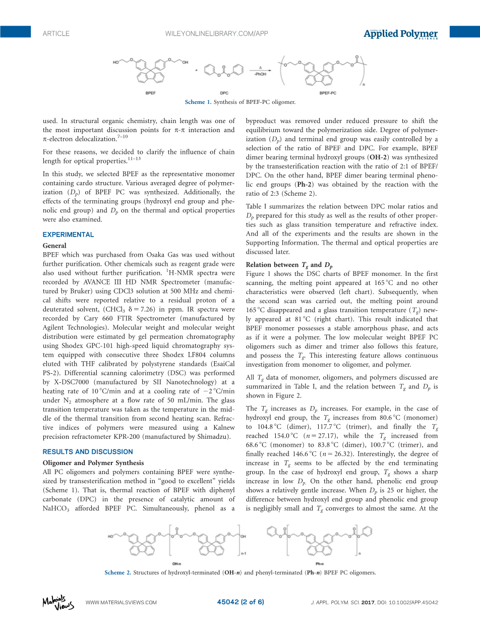 在本研究中,我们选择BPEF作为含cardo结构的代表性单体。合成了不同平均聚合度的BPEF聚碳酸酯。此外,还考察了端基(羟基和酚基)和Dp对热性能和光学性能的影响。