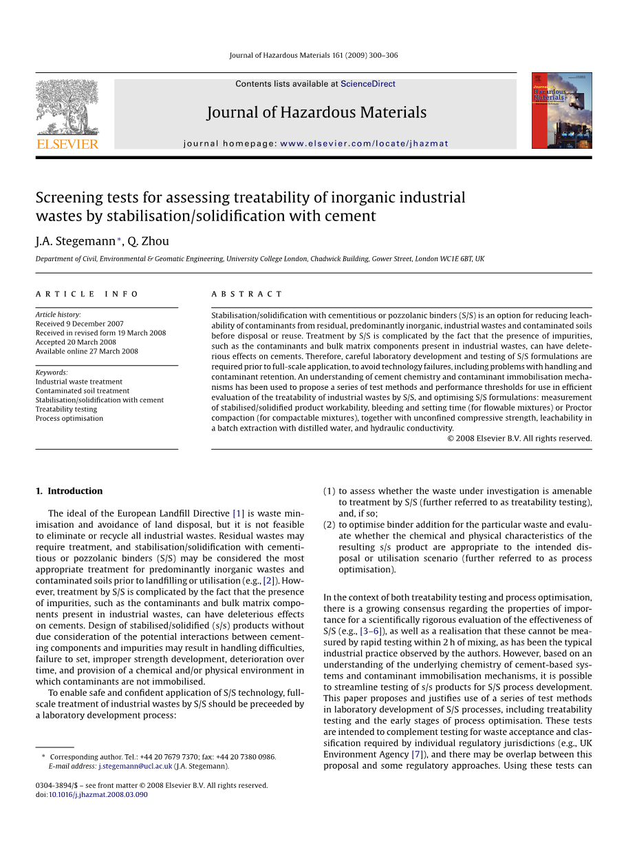通过用水泥稳定/固化的筛选试验来评估无机工业废物的可处理性外文翻译资料