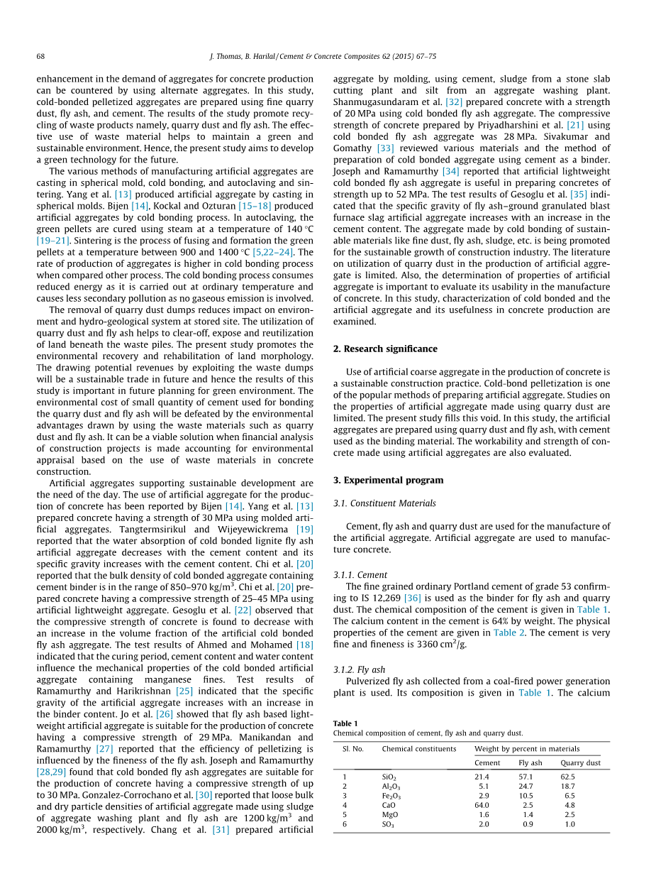 支撑可持续发展的人工骨料已成为当今的需求。Bijen[14]已经报道了使用人造骨料生产混凝土的情况。Yang等人[13]使用模制人造骨料制备强度为30 MPa的混凝土。Tangtermsirikul和Wijeyewickrema [19]报道了冷粘结褐煤粉煤灰人造骨料的吸水率随水泥含量的增加而降低,其比重随水泥含量的增加而增加。Chi等人[20]报道了含水泥粘结剂的冷粘结骨料的体积密度在850-970kg/m3的范围内。Chi等人[20]使用人造轻质骨料制备抗压强度为25-45MPa的混凝土。Gesoglu等人[22]观察到混凝土的抗压强度随着人工冷粘结粉煤灰骨料体积分数的增加而降低。Ahmed和Mohamed [18]的测试结果表明,养护期、水泥含量和含水量影响含锰冷粘结人工骨料的力学性能。Ramamurthy和Harikrishnan[25]的测试结果表明,人造骨料的比重随粘合剂含量的增加而增加。Jo等人[26]表明,粉煤灰基轻质人造骨料适用于生产抗压强度为29MPa的混凝土。Manikandan和Ramamurthy[27]报道说,造粒效率受粉煤灰细度的影响。Joseph和Ramamurthy[28,29]发现冷粘结粉煤灰骨料适合生产抗压强度30MPa的混凝土。Gonzalez-Corrochano等人[30]报道称,使用骨料洗涤厂污泥和粉煤灰制备的人工骨料的松散体积密度和干颗粒密度分别为1200kg/m3和2000kg/m3。Chang等人[31] 使用水泥、石板切割厂的污泥和骨料清洗厂的淤泥,通过模压制备了人工骨料。Shanmugasundaram等人[32]使用冷粘结粉煤灰骨料制备强度为20MPa的混凝土。Priyadharshini[21]等人使用冷粘结粉煤灰骨料制备的混凝土的抗压强度为28MPa。Sivakumar和Gomathy[33]综述了多种材料以及使用水泥作为粘合剂的冷粘结骨料的制备方法。Joseph和Ramamurthy[34]报告说,人造轻质冷粘结粉煤灰骨料可用于制备强度高达52MPa的混凝土。Gesoglu等人的测试结果[35]指出粉煤灰-磨细粒化高炉矿渣人工骨料的比重随水泥含量的增加而增加。通过冷粘结诸如细粉尘,粉煤灰,污泥等可持续性材料制成的骨料,正在促进建筑行业的可持续发展。关于采石场粉尘在人造骨料生产中的应用文献有限,此外,人工骨料性能的测定对于评估其在混凝土制造中的可用性也很重要。因此本研究对冷粘结和人工骨料的特性及其在混凝土生产中的用途进行了研究。