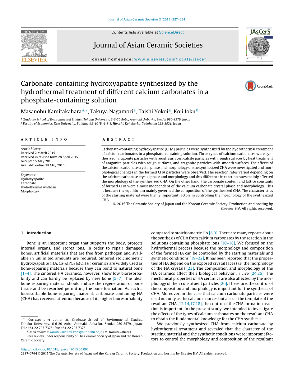 骨头是一个用来支撑我们的身体重要的部分,保护内在器官和储子离子。为了修复受损的骨骼,需要不含病原体的人造材料,并且可以无限量使用的材料。烧结的化学计量羟基磷灰石(HA,Ca10(PO4)6(OH)2)陶瓷因为它们可以结合到天然骨,被广泛用作骨修复材料。 然而,烧结的HA陶瓷显示出低的生物再吸收性,并且几乎不能被新的骨替代。 理想骨修复材料应诱导骨组织的再生,并吸收允许骨形成。 作为这种生物可再吸收的骨修复材料,含碳酸盐的HA(CHA)由于其与化学计量的HA相比具有更高的生物再吸收性而受到广泛关注。关于通过在含磷酸根离子的溶液中的反应合成碳酸钙的许多报道。我们专注于水热过程,因为形成的HA的形态和组成可以通过起始材料和合成条件来控制。已经报道,HA的性质取决于暴露的晶面(即HA晶体的形态)。 HA陶瓷的组成和形态影响其在体内的生物学行为。 HA陶瓷的机械性能也受其构成颗粒的形态影响。因此,组成和形态的控制对CHA的合成是重要的。此外,在碳酸钙颗粒不仅用作钙源而且用作所得CHA的模板的情况下,CHA形成反应的控制是重要的。在本研究中,我们旨在研究碳酸钙类型对所得CHA的影响,以获得CHA合成的基础知识。