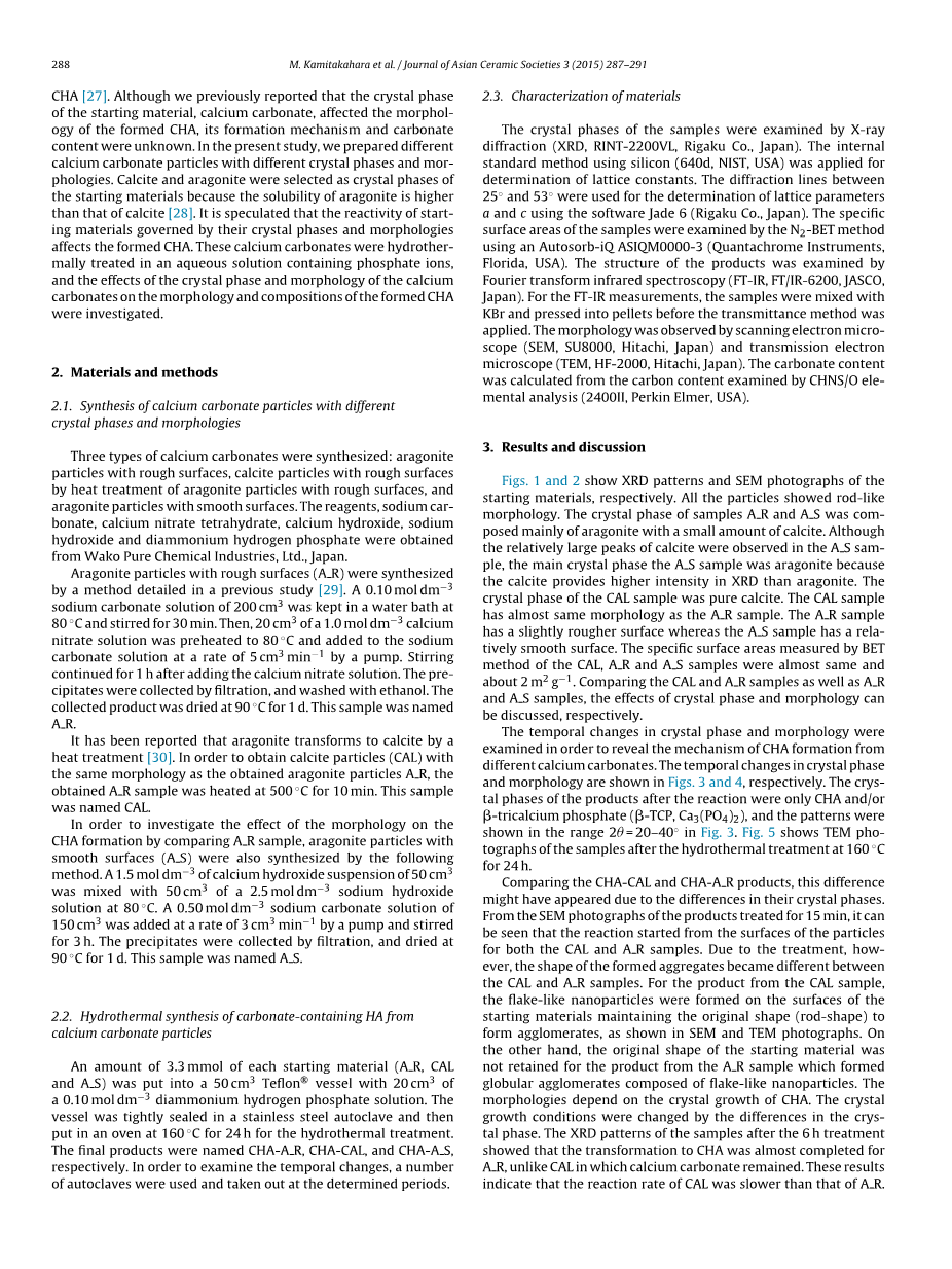 我们以前通过水热处理从碳酸钙中合成了CHA,并表明起始材料的性质和合成条件是控制所得CHA的形态和组成的重要因素。虽然我们以前报道了起始材料,碳酸钙的晶体相影响形成的CHA的形态,其形成机理和碳酸盐含量是未知的。在本研究中,我们制备了不同晶相和形态的不同碳酸钙颗粒。选择方解石和霰石作为原料的晶相,因为文石的溶解度高于方解石。据推测,由其结晶相和形态决定的原料的反应性影响形成的CHA。将这些碳酸钙在含有磷酸根离子的水溶液中水热处理,研究了碳酸钙的结晶相和形态对形成的CHA的形态和组成的影响