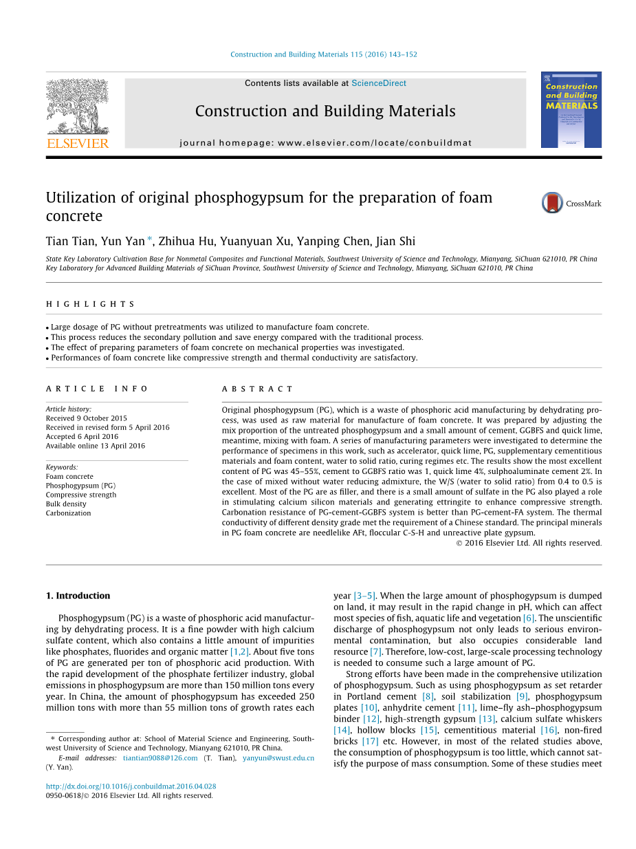 在磷石膏的综合利用方面做出了很大的努力,例如事要使用磷石膏在布兰特水泥、稳定土壤、无水硬石膏、石灰粉煤灰磷石膏粘结剂、高强度石膏、硫酸钙晶须、空心块、胶凝材料,不燃砖等中作为缓凝剂。然而,在上述的大部分研究中,磷石膏的消耗量太少,不能满足大量消耗的目的。这些研究中的一些满足了需求,但是他们必须对磷石膏做一些预处理,像热处理或者洗涤,其可能会消耗大量的能量,并且产生二次污染导致成本增加等。因此,现在急需大规模和低成本的生产技术, Yang et al利用磷石膏作为制备非高压充气处理的混凝土,然而,由于充气混凝土中大量的相互连接的空隙,收缩,碳化和吸水性是非常严重的。