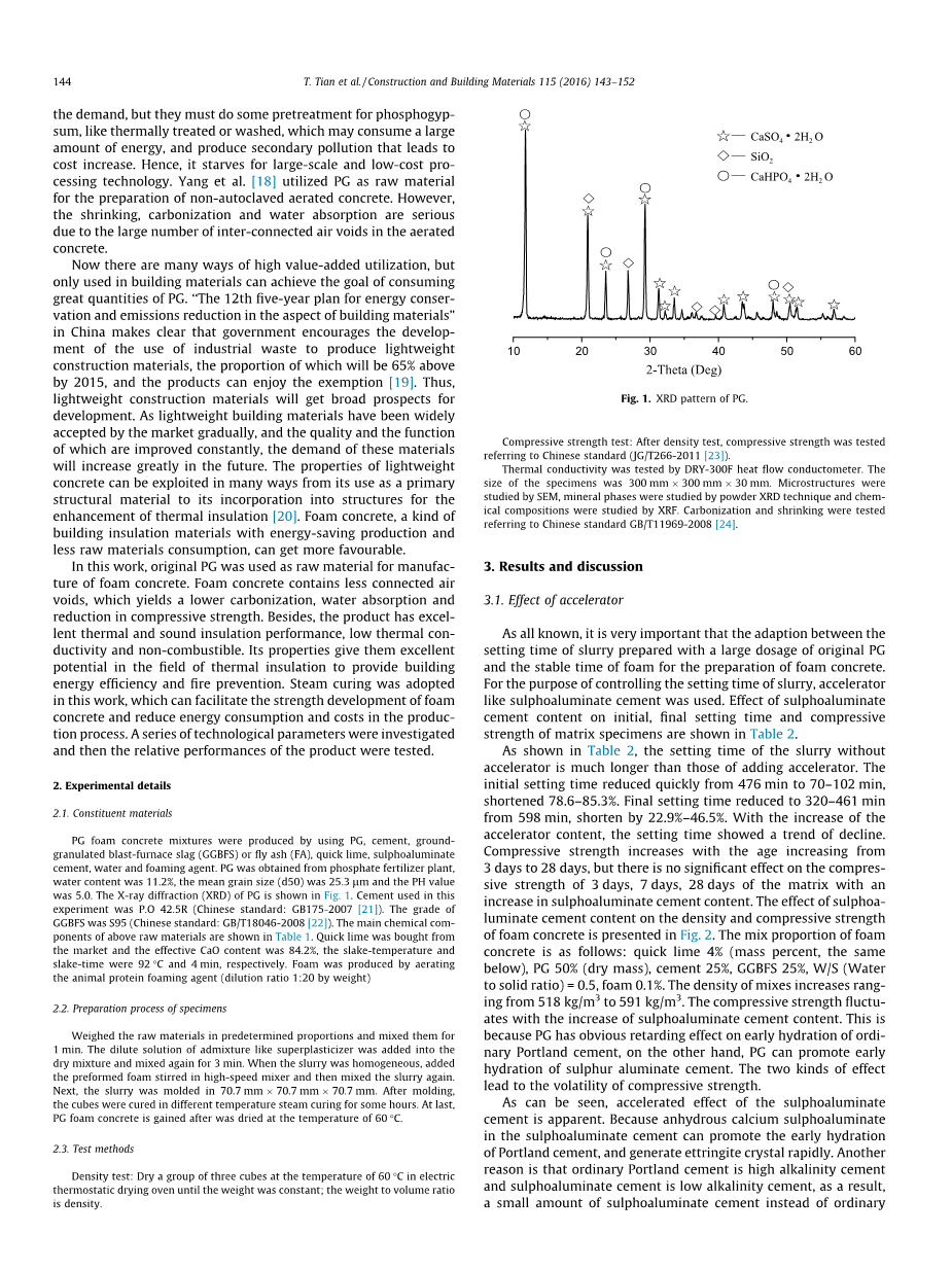 PG泡沫混凝土混合物通过使用PG,水泥,研磨的粒状高炉矿渣(GGBFS)或灰分(FA),生石灰,硫铝酸盐水泥,水和发泡剂等制成的。PG从磷肥厂获得,含水量为11.2%,平均颗粒尺寸(d50)为25.3mu;m和PH值为5.0。PG的X射线衍射(XRD)示于图1。 用于此的水泥实验为P.O 42.5R(中文标准:GB175-2007 [21])。GGBFS的分级为S95(中文标准:GB / T18046-2008 [22]),上述原材料的主要化学成分如表1所示,上述原料的主要化学成分如表1所示。生石灰从市场上购买,有效CaO含量为84.2%,煤渣温度和熟化时间分别为92℃和4分钟,泡沫通过动物蛋白发泡剂产生。
