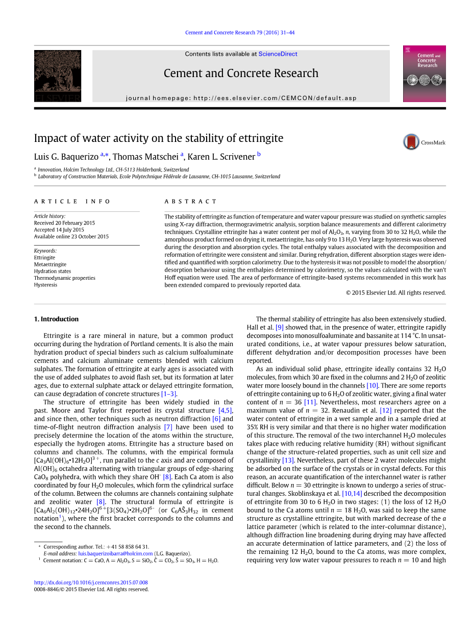 Zhou和Glasser的详细工作[15]描述了钙矾石作为水蒸气压(PH2O)和温度的函数的稳定性。在低PH2O(其值随温度降低而降低)时,含水量低于n = 30H 2 O至10H 2 O的最小值,结晶度逐渐降低。不同的脱水阶段之间没有区别,尽管据称分解产物称为泛铁矿,具有10至13 H 2 O的可变含水量,并且对于X射线衍射而言为非晶态或近似的。这项研究的一个重要成果是确定了分解过程的可逆性,发生了明显的滞后。钙矾石的改性在每个温度下都发生在相对较高的PH 2 O,根据作者可能是由于水对晶体缺陷的凝结和引发钙矾石成核的表面。然而,没有进一步的解释描述歇斯底里的行为。 Clark等人还观察到从无定形产物到结晶产物的这种可逆性。 [16]对于经过高压的钙矾石。在随后的一项工作中,Zhou等[13]表明,亚铁素体显示出类似于钙矾土的电子衍射图,晶格参数明显降低,c变化小,这表明柱[Ca3Al(OH)6] 3 被保留但移动更近一起。