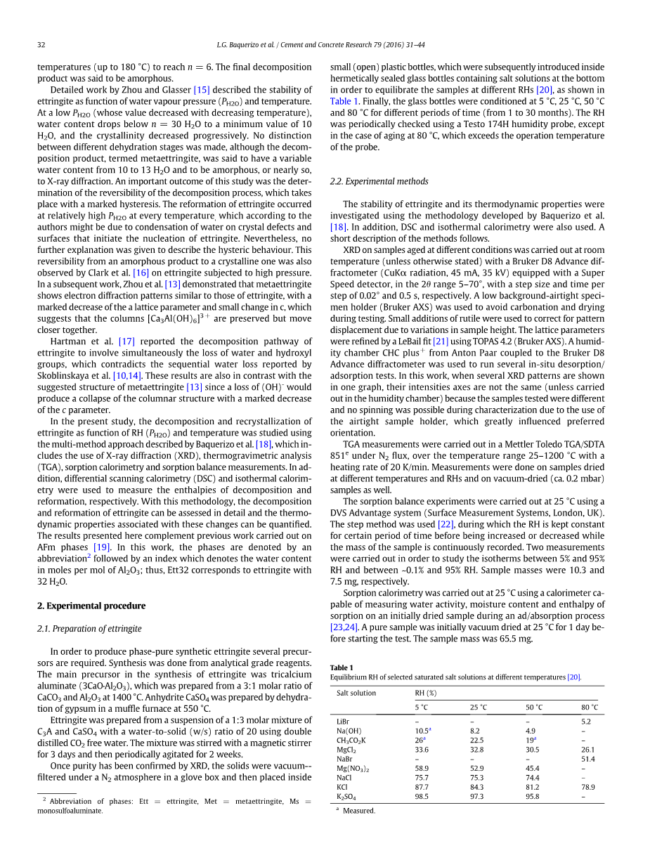 在本研究中,使用Baquerizo等人描述的多方法研究了钙矾石的分解和重结晶作为RH(PH2O)和温度的函数。 [18],其中包括使用X射线衍射(XRD),热重分析(TGA),吸附量热法和吸附平衡测量。另外,采用差示扫描量热法(DSC)和等温热量法分别测定分解和重组的焓。通过这种方法,可以详细评估钙矾石的分解和改性,并且可以量化与这些变化相关的热动力学性质。这里提出的结果补充了以前在AFm阶段进行的工作[19]。在这项工作中,这些阶段用缩写2表示,后面是一个指数,它表示每摩尔Al2O3的含水摩尔数;因此,Ett32对应于具有32H 2 O的钙矾石。