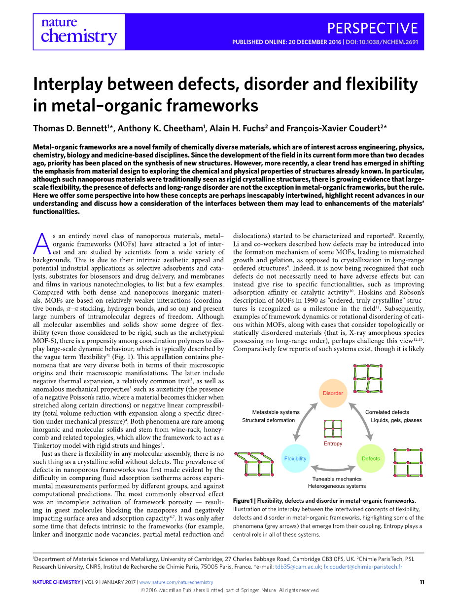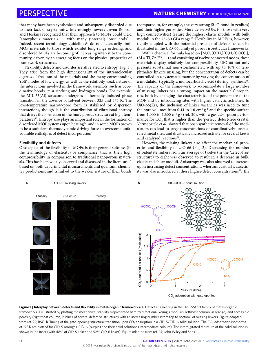 尽管联系的复杂性开始出现,各方面尚未得到充分的了解,但MOF中的灵活性,缺陷和混乱的发生是不可避免的相互关联的。尽管在一个系统中组合无机和有机组分的化学已经建立了很好的优势,但这种二元性的物理后果往往被认为是有害的。然而,这种独特的融合使得灵活性和混乱性更常见地与有机聚合物相关联——与经典氧化物化学的缺陷相联系。 我们在这里举例说明灵活性,缺陷和紊乱的存在引起的复杂性。
