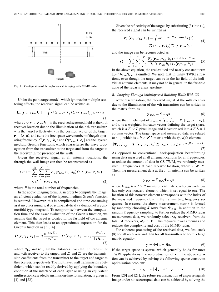 关键字:压缩感知(CS),多输入多输出(MIMO)雷达,多层壁,合成孔径雷达(SAR),穿墙雷达成像(TWRI)