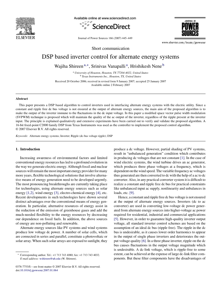关键词:替代能源系统;逆变器;波纹(直流总线电压纹波);DSP