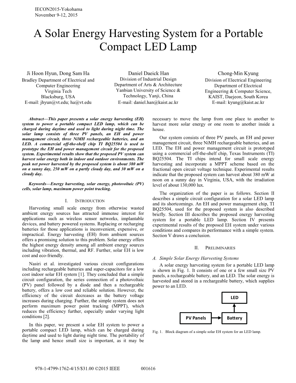 本文介绍了一种太阳能EH系统,为便携式小型LED灯供电。可在白天进行充电,并在夜间使用。太阳能灯由三个光伏面板,一个EH和电源管理电路,三个镍氢充电电池和一个LED组成。一个商用的现成芯片TIBQ25504被用于为所提出的系统建立EH和电源管理电路的原型。