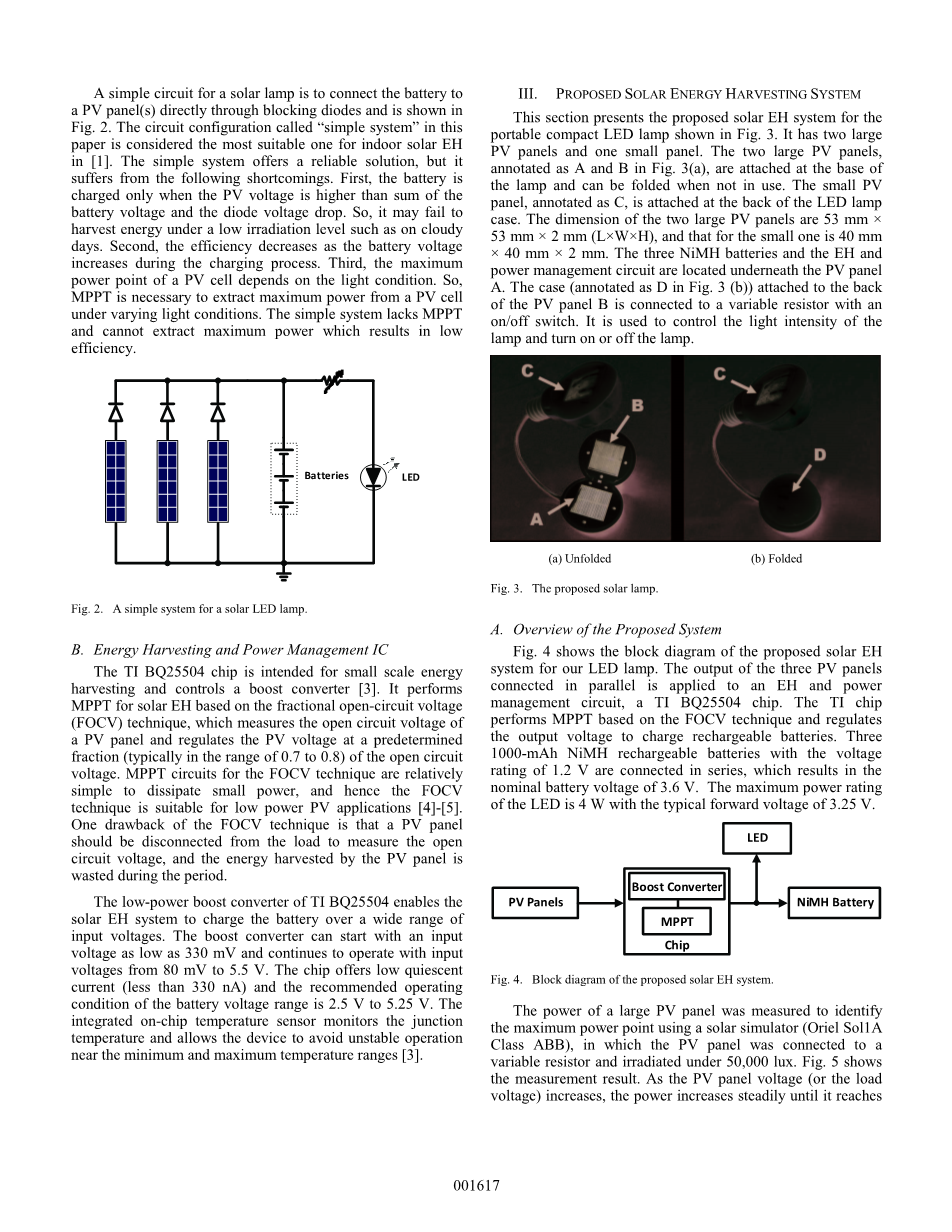 本文的结构如下。第二节描述了太阳能LED灯的简单电路配置及其缺点。还简要介绍了用于该系统的EH和电源管理芯片TIBQ25504。第三节描述了便携式LED灯的能量收集系统。第四节介绍了在各种条件下提出的EH系统的实验结果,并将其性能与一个简单的系统进行比较,第五部分得出结论。