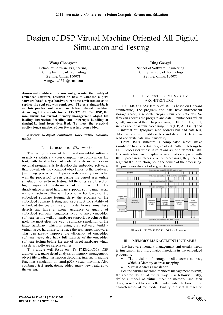 本文将重点研究TI公司的TMS320C55 DSP架构,详细分析SIMDSP55虚拟机上的内存管理、对象文件加载、指令解码、中断处理功能仿真。此外,结合测试应用,增加了许多新的特点,以测试。