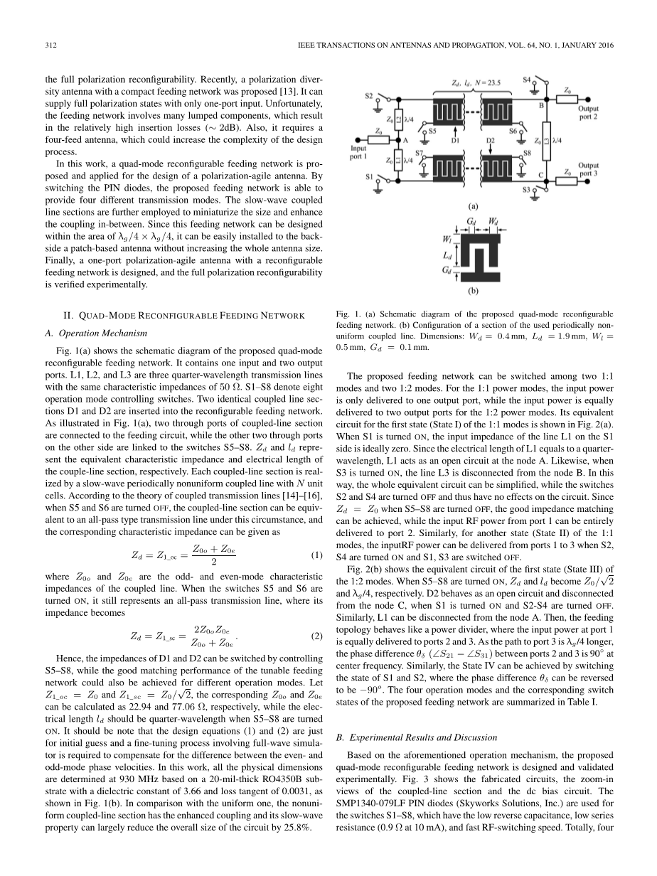 提出的反馈网络可以在两个1:1模式和两个1:2之间切换。对于1:1的功率模式,输入功率只传输给一个输出端口,在1:2模式下输入功率传输给两个输出端口。其等效电路的状态(状态 I)1:1模式如图2(a)所示。S1打开时, S1侧L1输入阻抗是理想的零。因为L1的电长度等于四分之一波长,在节点A,L1是开路。同样地,当打开S3,L3断开节点B。通过这种方式,可以简化整个等效电路,开关S2和S4是关闭的,因此没有对电路造成影响。因为Zd = Z0 ,当S5-S8关闭时,可以实现良好的阻抗匹配,输入功率从端口1完全传输给端口2同样,另一个状态(状态II)的1:1模式,i输入RF功率可以从端口1到3 ,S2,S4打开,S1,S3关闭。图2(b)显示了第一个状态的等效电路(1:2的状态III)模式。当S5-S8打开,Zd和ld分别成为Z0 /radic;2和lambda;g / 4。D2成为一个开放的电路B并且和节点C断开,当打开S1和S2-S4关闭。同样,L1可以和节点A断开。然后,反馈拓扑作为一个功率分配器,端口1的输入功率相等的传送到端口2和3。当通往端口3是lambda;g / 4,端口2和3之间相位差theta;delta;(ang;S21minus;ang;S31)在中心频率处是90◦。同样,第四状态可以通过转换S1和S2的状态实现,相位差theta;delta;能够逆转到minus;90 度。反馈网络的四种操作模式和相应的开关状态总结在表I。