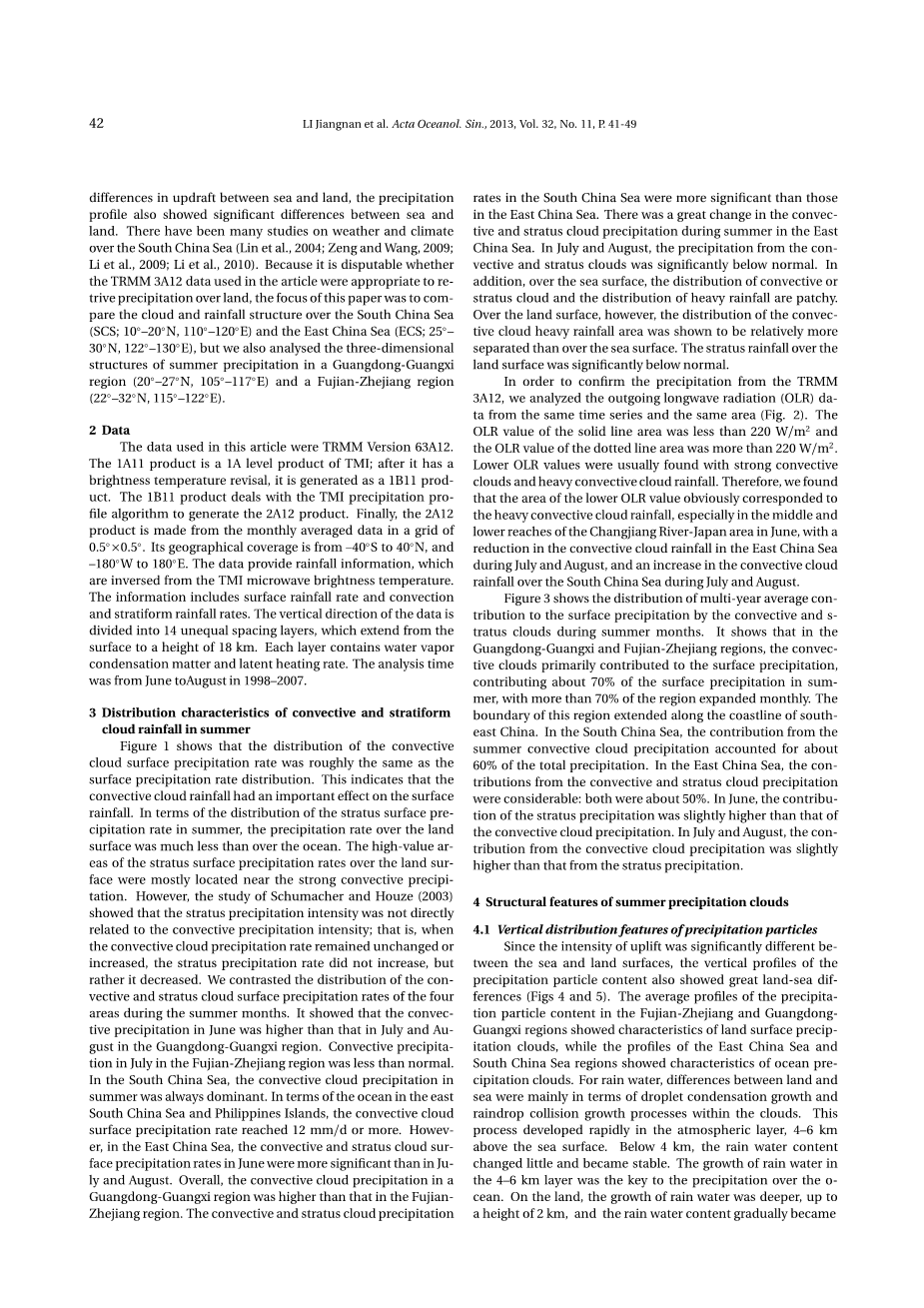 图1表明,对流的分布云表面沉淀率大致相同表面沉淀率分布。这表明对流云降水有重要影响的表面上降雨。的分布层表面沉淀在夏天,在陆地降水率表面比在海洋。高价值区域层表面的地表降水率大多是附近的强烈的对流降水。然而,舒马赫的研究和Houze(2003)表明,层云降水强度并不直接与对流降水强度;也就是说,什么时候对流云降水率保持不变增加,层云降水率没有增加,但是相反,它降低了。我们对比了对流的分布表面和层云降水率的四个在夏天。它表明,对流降水量高于6月,7月和8月在Guangdong-Guangxi地区。对流降水7月Fujian-Zhejiang地区低于正常。在中国南海,对流云降水夏天总是占主导地位。在东方的海洋南海和菲律宾群岛,对流云表面沉淀率达到12毫米/ d或更多。然而,在中国东海,表面的对流和层云6月降水率比七月更重要和8月。总的来说,对流云降水Guangdong-Guangxi地区高于福建-浙江地区。