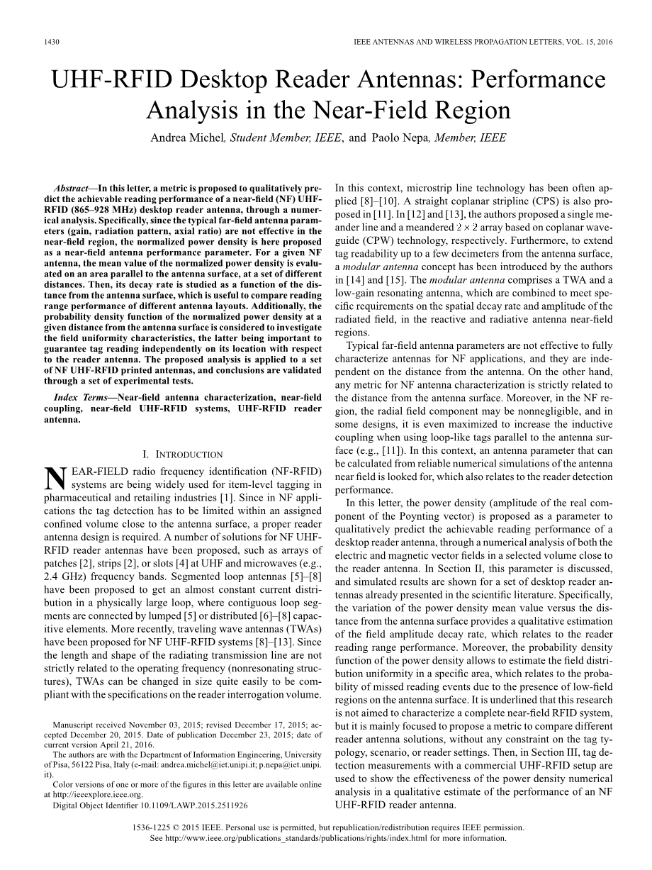 摘要:本文提出了一种通过数值分析定性预测近场UHF-RFID(865-928MHz)台式读写器天线的可实现读写性能的指标。具体来说,由于典型的远场天线参数(增益、辐射方向图、轴比)在近场区域无效,本文将归一化功率密度作为近场天线性能参数。对于一个给定的近场天线,在一组不同距离的平行于天线表面的区域上计算归一化功率密度的平均值。然后,研究其衰减率与距天线表面的距离的函数关系,有助于比较不同天线布局的读取范围性能。此外,还考虑了在天线表面一定距离处归一化功率密度的概率密度函数来研究场均匀性特性,后者对于确保标签在读卡器天线上的位置独立读取具有重要意义。将所提出的分析方法应用于一套近场UHF RFID印刷天线,并通过一套实验测试验证了结论的正确性。