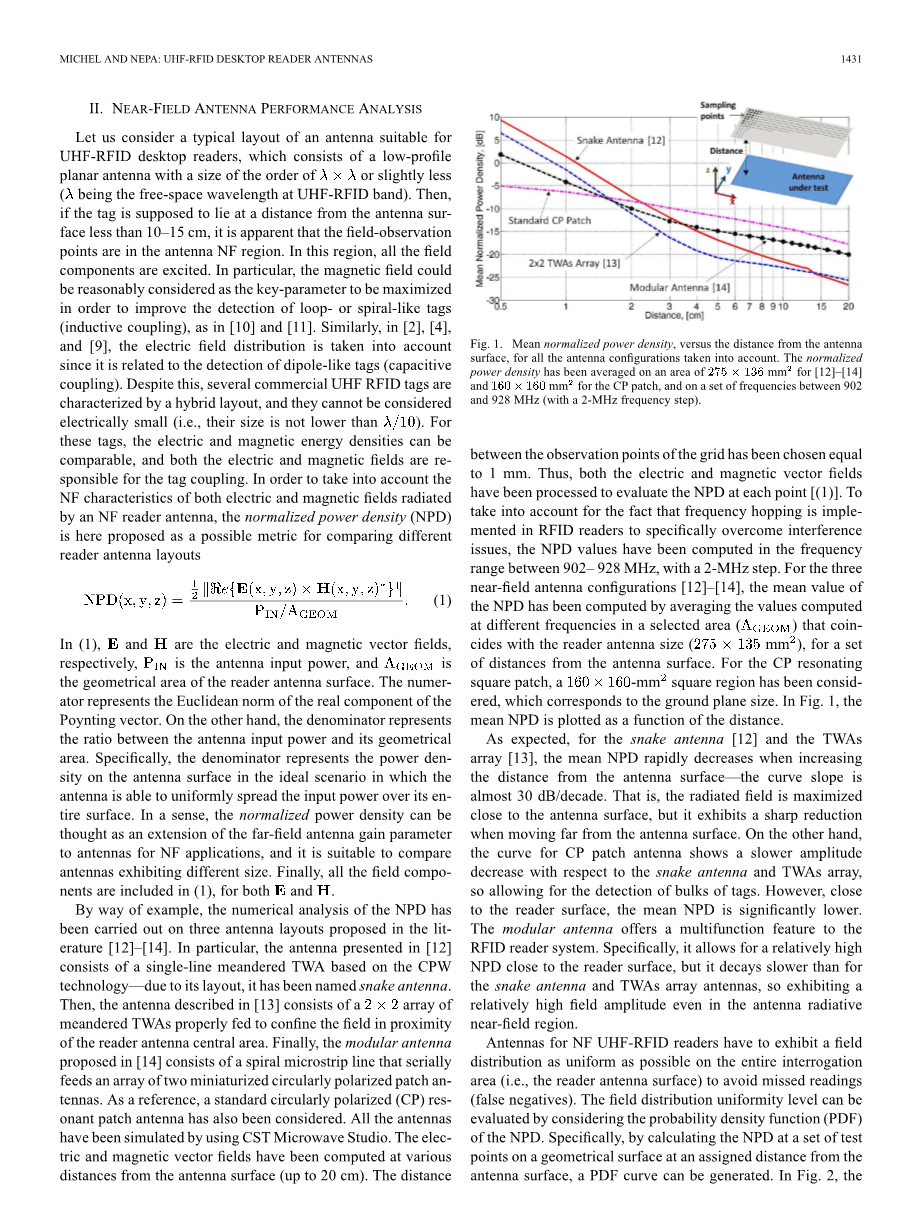 考虑一种适用于UHF-RFID台式阅读器的天线的典型布局,该天线由一个尺寸为或稍小的低剖平面天线组成(是UHF-RFID波段的自由空间波长)。然后,如果标签应该位于距离天线表面小于10–15 cm的位置,则很明显,现场观测点位于天线近场区域。在这个区域,所有的场分量都被激发。特别是可以合理地将磁场视为最大化的关键参数,以提高对环形或螺旋状标签(电感耦合)的检测,如文献[10]和[11]中所述。同样地,在文献[2]、[4]和[9]中,要考虑电场分布,因为它与偶极子标签(电容耦合)的检测有关。尽管如此,一些商用超高频射频识别标签的特点是混合布局,对于这些标签,电场和磁场密度相当,电场和磁场都是标签耦合的原因。为了考虑近场读卡器天线辐射电场和磁场的近场特性,本文提出了归一化功率密度(NPD)作为比较不同读卡器天线布局的参数