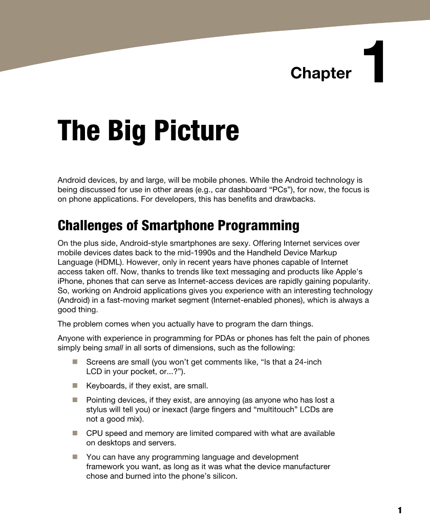 �你可以得到一个非常坚挺和独立的框架,使得你的程序能够成为手机上的一个“好市民”,并且不会干扰手机上的其他程序或者操作系统。或许正如你所希望的那样,这本书的大部分是给你介绍怎么编程和处理各种限制,并且 利用它的各种能力给你。