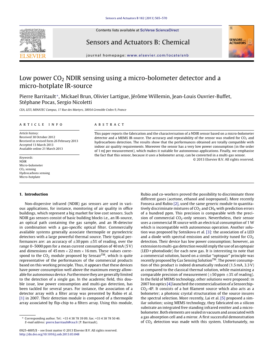 在本文中,我们报告了一种基于MEMS技术的低功耗气体传感器,可以扩展到多气体传感器。它结合了独立的微加热板,其表现为提供大红外发射光谱的黑体,适用于CO2检测的商用滤光器,以及用于信号检测的微测辐射热计。值得注意的是,测辐射热计是测辐射热计阵列的一个组成部分,如果它与一系列特定的过滤器结合使用,它就可以开辟多气体传感器领域。