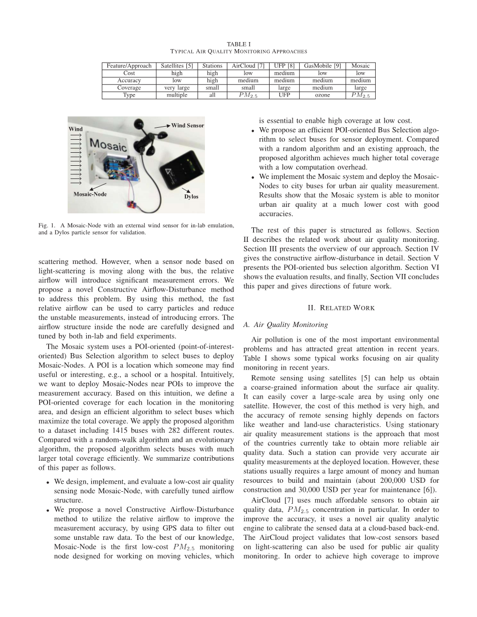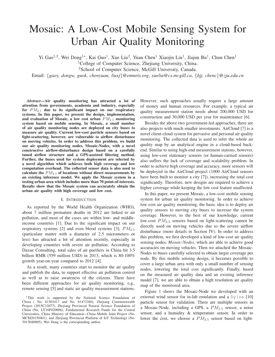在本文中,我们介绍了Mosaic,一种用于城市空气质量监测的低成本移动传感系统。为了实现低成本的空气质量监测,基本思路是将空气质量传感器部署到移动城市公交车上以增加系统覆盖范围。然而,据我们所知,目前基于光散射的低成本PM2.5传感器由于严重的气流扰动而无法直接用于移动车辆(详见第IV部分)。为了解决这个问题,我们首先开发了一种低成本的空气质量传感节点Mosaic-Nodes,它们能够在移动的车辆上实现良好的精度。然后我们将MosaicNodes附加到精心选择的总线上,以获得每个节点更大的覆盖范围。通过这种移动传感设计,可以覆盖只有少量传感节点的大城市区域,从而显着降低总成本。最后,根据测量的空气质量数据和现有的推理模型[7],我们能够获得监测区域的高分辨率空气质量图。