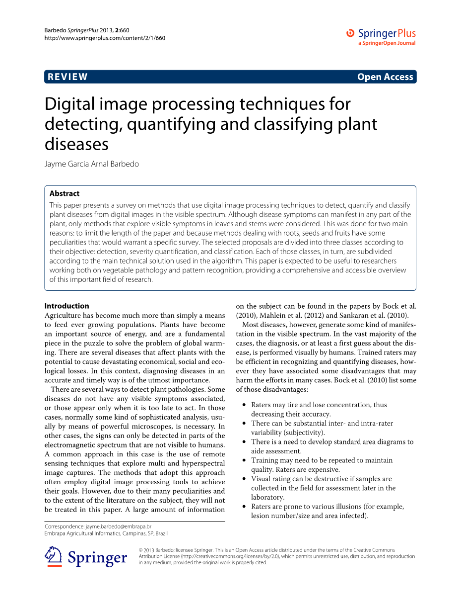 植物病理可能在植物的不同部位出现。有些方法探索几乎所有这些部分的视觉提示,如根(Smith和Dickson 1991),核(Ahmad et al。1999),水果(Aleixos et al。2002; Corkidi et al。2005;Loacute;pez-Garciacute;aet al。2010),茎和叶。如前所述,这项工作集中在后两者,特别是叶。