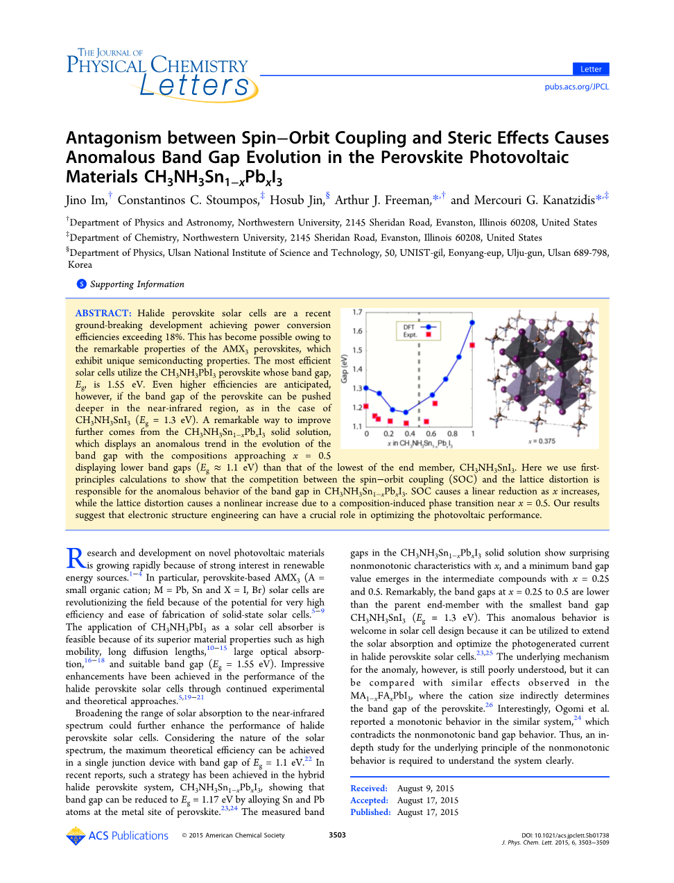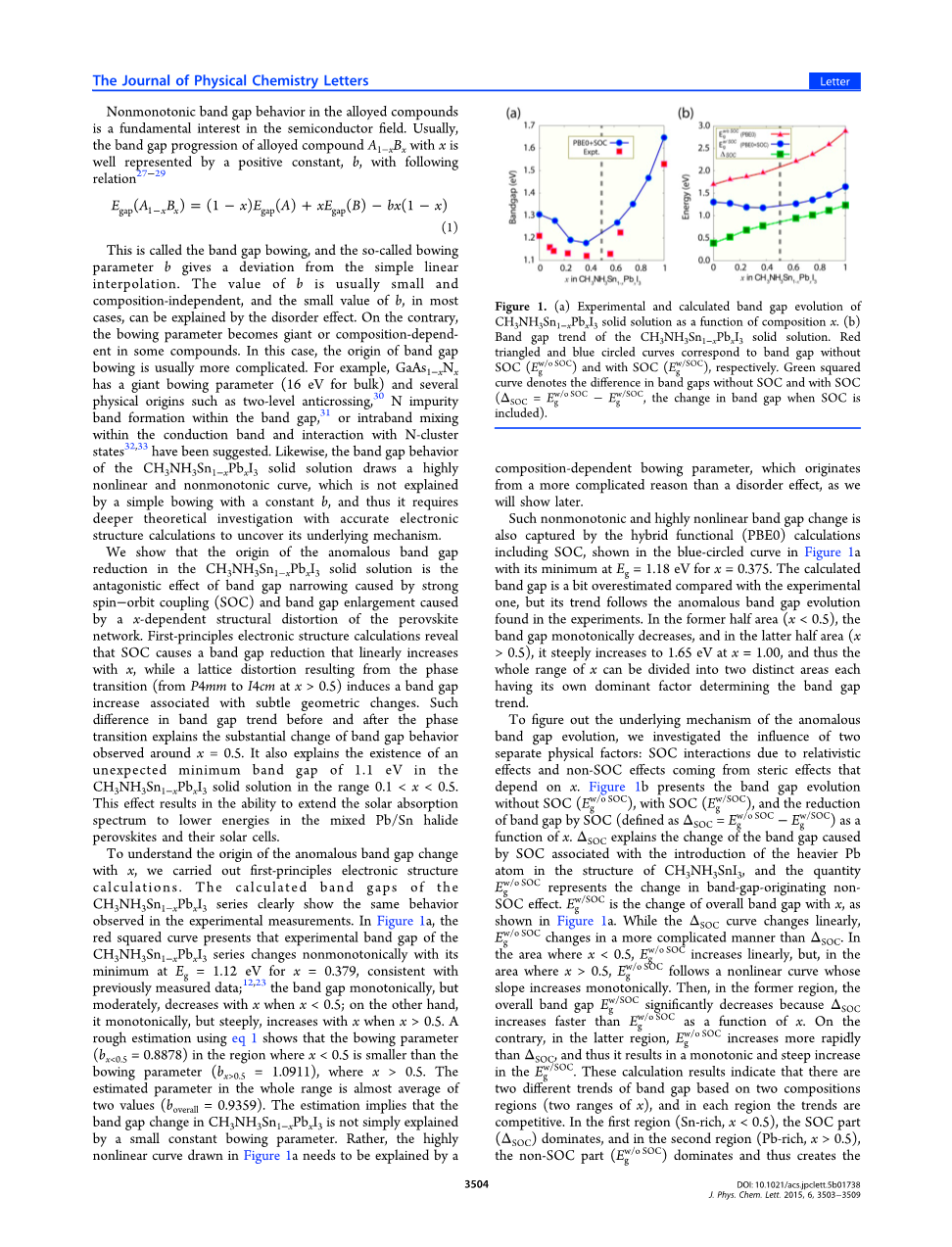 我们显示CH3NH3Sn1-xPbxI3固溶体中异常带隙减少的起源是由强自旋轨道耦合(SOC)引起的带隙变窄的拮抗作用和由x依赖的结构失真引起的带隙扩大钙钛矿网。第一原理电子结构计算显示,SOC引起带宽随着x线性增加的带隙减小,而由相变(从x4gt; P4mm到I4cm)导致的晶格失真会导致与微妙的几何变化相关的带隙增加。在相变之前和之后的带隙趋势的这种差异解释了在x = 0.5附近观察到的带隙行为的实质变化。它还解释了在 0.1 lt;x lt;0.5 的范围内在CH3NH3Sn1-xPbxI3固溶体中存在1.1eV的意想不到的最小带隙的存在。这种效应导致将太阳吸收光谱扩展到混合Pb / Sn卤化物钙钛矿及其太阳能电池中的较低能量的能力。
