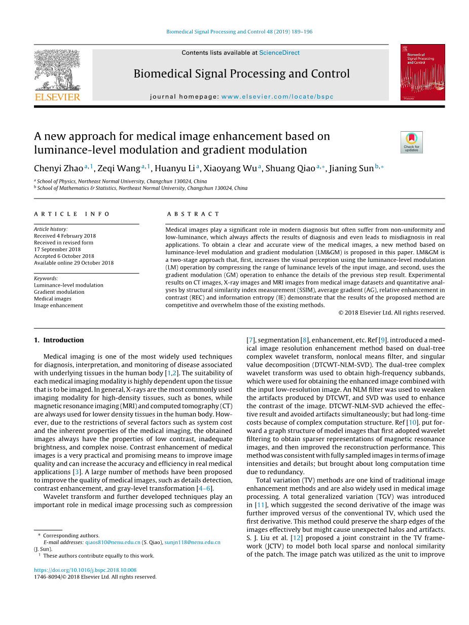 医学成像是用于诊断、解释和监测与人体下层组织相关的疾病的最广泛使用的技术之一[1,2]。每种医学成像模态的适合性高度依赖于要成像的组织。通常,X射线是高密度组织(例如骨骼)最常用的成像模态,而磁共振成像(MRI)和计算机断层扫描(CT)常用于人体中的低密度组织。然而,由于诸如系统成本和医学成像的固有特性等几个因素的限制,所获得的图像总是具有低对比度、低亮度和含有复杂噪声的特性。医学图像的对比度增强是一种非常实用且有前景的手段,它可以提高图像质量,并可以提高实际医疗应用的准确性和效率[3]。现已经提出了许多方法来改善医学图像的质量,例如细节检测,对比度增强和灰度级变换[4-6]。