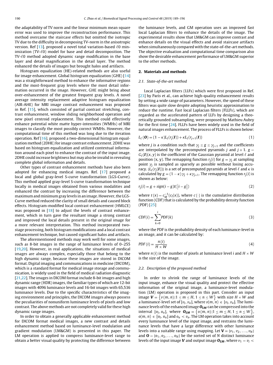 总变差(TV)方法是一种传统的图像增强方法,通常广泛用于医学图像处理。在[11]中引入了总广义变化(TGV)方法,这表明图像的二阶导数相对于使用一阶导数的传统TV有了进一步的改进。此方法可以有效地保留图像的锐利边缘,但可能会导致额外的晕圈和伪影。 S.J.Liu等[12]提出了TV框架工作(JCTV)中的联合约束,以图像块为单位,以模拟补丁的局部稀疏和非局部相似性提高了电视规范的适应性,采用线性最小均方误差提高了其重建性能。这种方法克服了阶梯效应,但省略了各向同性TV,这是由于在各向异性版本中难以分解TV规范。参考文献[13]提出了一种新的基于总变差的0 min-imization(TV-0)模型来用于图像的基本和细节分解。 TV-0方法采用基层动态范围修改和细节层细节放大。该方法增强了图像的细节,但导致了光晕和假象。
