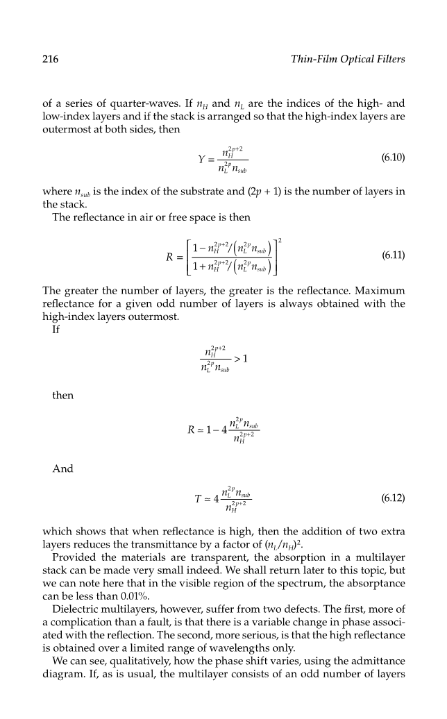 在第1章中,提到可以从高低折射率交替的的四分之一波长厚介质膜系获得高反射率。这是因为当从膜系所有界面上反射的光束回到前表面时它们具有相同的相位,从而发生相长干涉。第3.1节给出了一系列四分之一波长多层膜的光学导纳的表达式。 如果和是高折射率层和低折射率层的指标,并且如果使得高折射率层在两侧均是在最外层,则