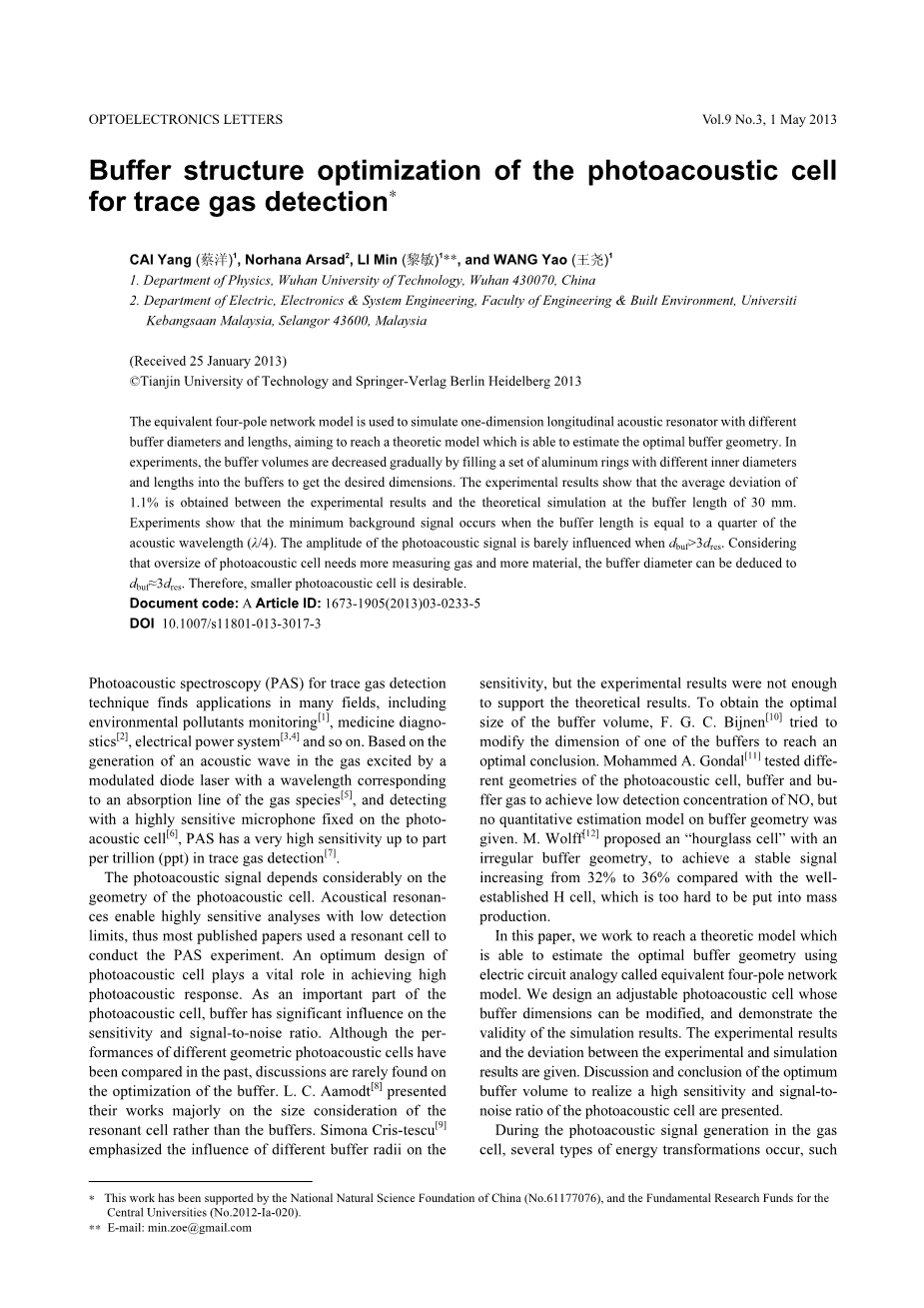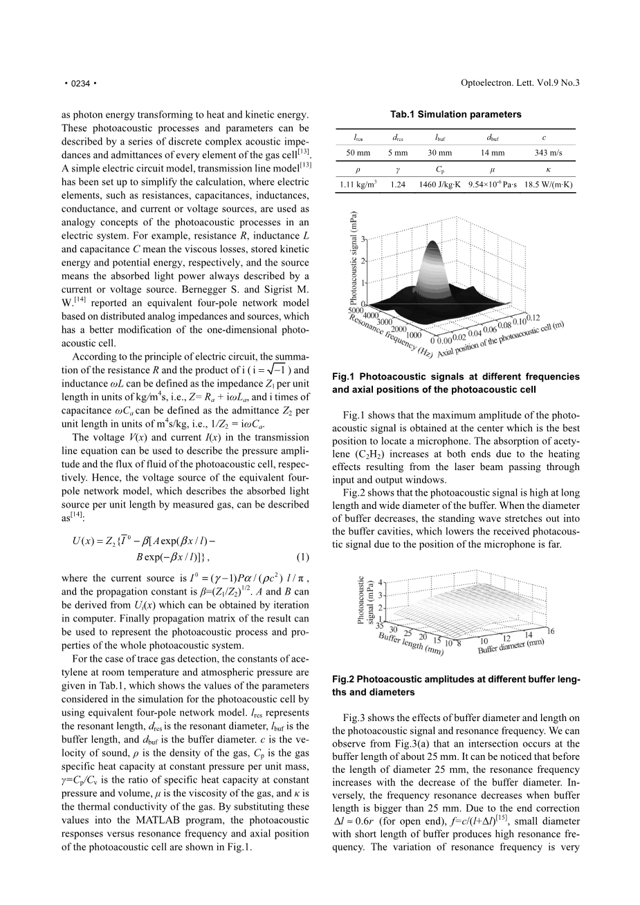 摘要-为了能够获得最优缓冲几何形状的理论模型,采用等效四极网络模型模拟具有不同缓冲池直径和长度的一维纵光声谐振腔。在实验中,利用不同内径和长度的一组铝环填充缓冲池,以根据实验需要连续改变缓冲池体积。实验结果显示,缓冲池长度为30 mm的理论结果与实验的平均偏差为1.1%;当缓冲池长度等于声波长的四分之一(lambda;/ 4)时,背景信号最低;当dbufgt; 3dres时,光声信号的幅度几乎不受影响。考虑到光声池的尺寸过大则消耗更多的的气体和材料,因而缓冲区直径取dbufasymp;3dres。较小的光声单元是理想的。