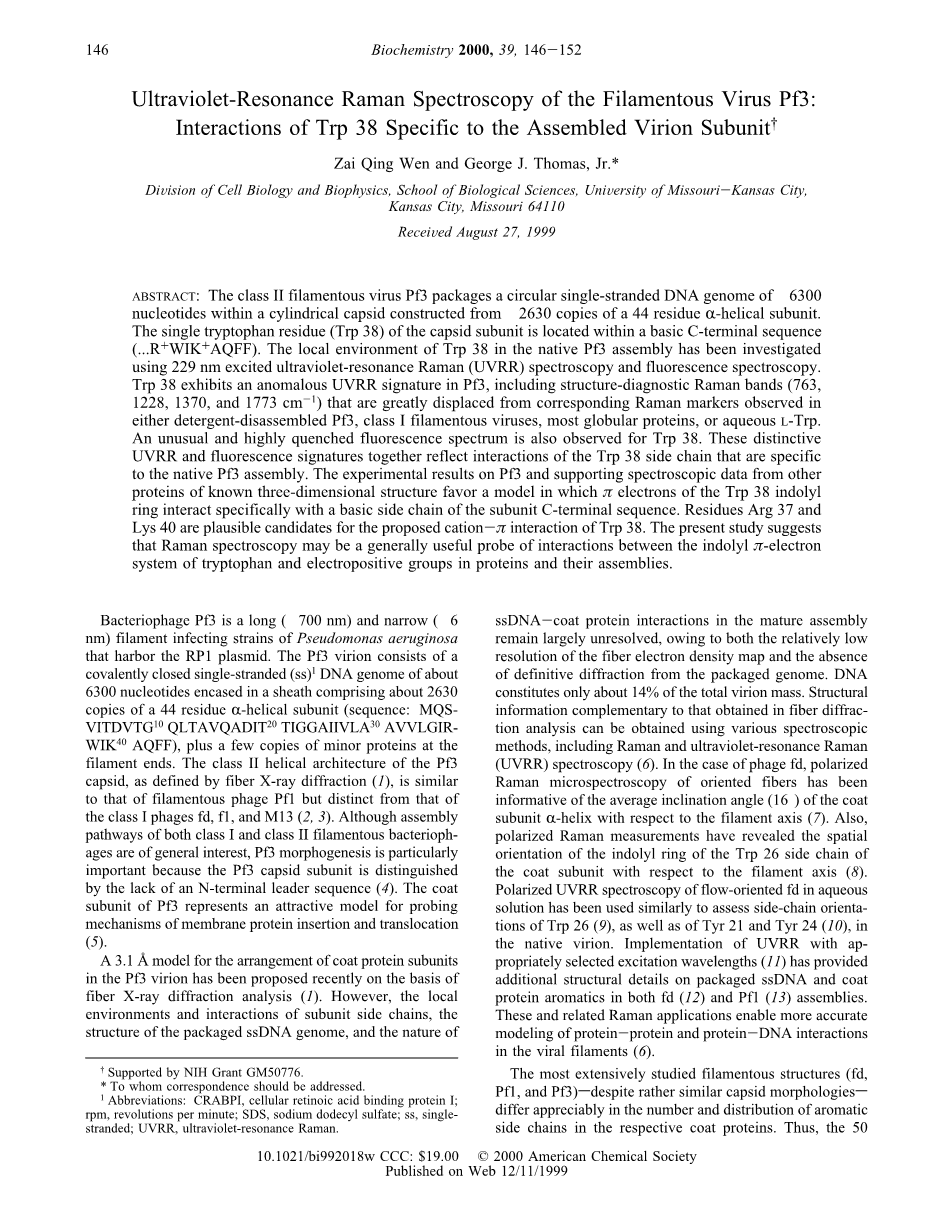 丝状病毒Pf3的紫外共振拉曼光谱:特定于组装病毒载体的Trp 38的相互作用