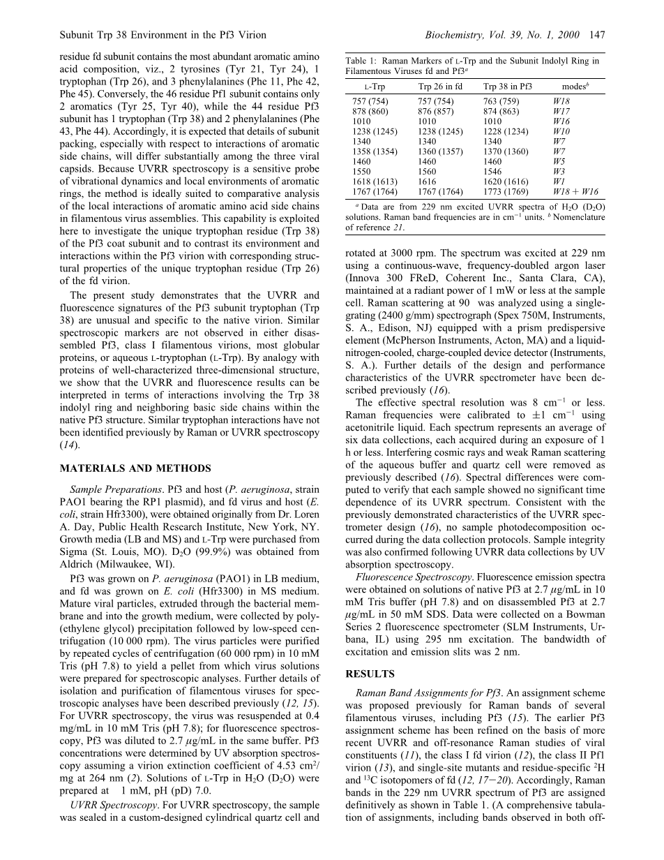 本研究表明,Pf3亚基色氨酸(Trp 38)的UVRR和荧光特征对于天然病毒体是不寻常的和特异性的。在分解的Pf3,I级丝状病毒粒子,大多数球状蛋白质或L-色氨酸水溶液(L-Trp)中未观察到类似的光谱标记。通过类比具有良好表征的三维结构的蛋白质,我们证明UVRR和荧光结果可以解释为涉及Trp38吲哚环和天然Pf3结构内的相邻碱性侧链的相互作用。之前并未通过拉曼或UVRR光谱鉴定出相似的色氨酸相互作用(14)。