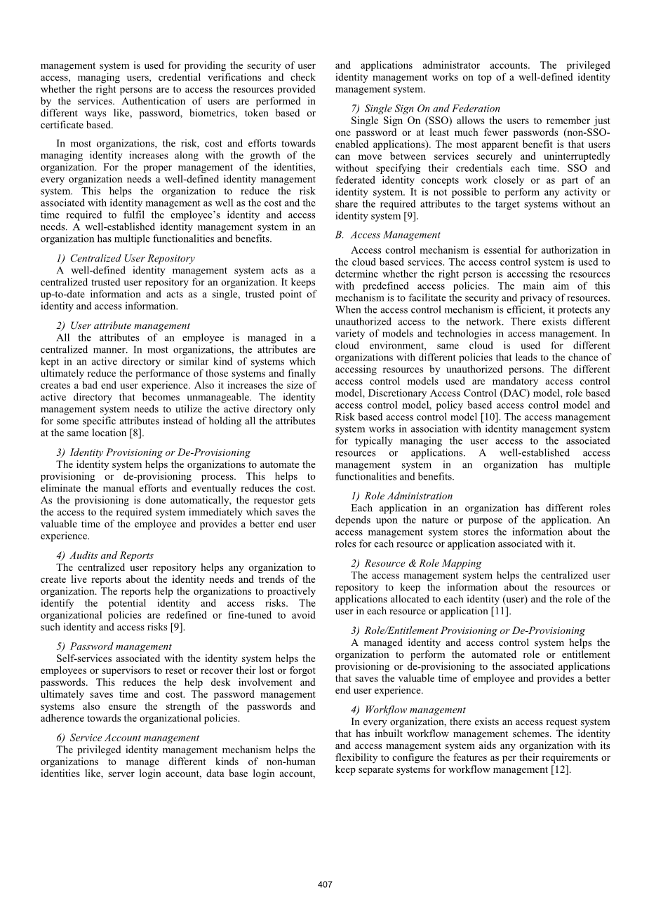 访问控制机制对于基于云的服务的授权至关重要。访问控制系统用于确定正确的人是否正在使用预定义的访问策略访问资源。这一机制的主要目的是促进资源的安全和隐私。当访问控制机制有效时,它保护对网络的任何未授权访问。在访问管理中存在不同种类的模型和技术。在云环境中,相同的云用于具有不同策略的不同组织,这导致未授权人员访问资源的机会。所使用的不同的访问控制模型是强制访问控制模型,任意访问控制(DAC)模型,基于角色的访问控制模型,基于策略的访问控制模型和基于风险的访问控制模型[10]。访问管理系统与身份管理系统相关联地工作,用于管理用户对相关联的资源或应用的访问。组织中完善的访问管理系统具有多种功能和优点。