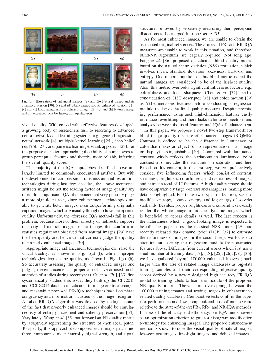 通过相机/智能手机拍摄或由计算机创建的照片始终需要进行后处理,以便在各种应用场景(例如,目标检测和识别)中实现更好的可视化和增强的实用性。2016年5月28日收到的主要手稿之一;2016年10月19日修订;2016年12月31日接受。出版日期2017年3月6日;当前版本日期2018年3月15日。这项工作部分由澳大利亚研究委员会在FT-130101457项目、DP-140102164项目和LP-150100671项目下提供支持,部分由新加坡教育部在M4011379项目和RG141/14项目下提供支持。K、 Gu和J.-F.Qiao在北京理工大学信息技术学院计算智能与智能系统北京重点实验室工作,北京100124(电子邮件:guke)。doctor@gmail.com;junfeiq@bjut.edu.cn)Tao博士就职于澳大利亚新南威尔士州悉尼悉尼大学信息技术学院工程与信息技术学院(电子邮件:dacheng)。tao@sydney.edu.au).W.Lin在新加坡南洋理工大学计算机科学与工程学院工作,邮编639798(电子邮件:wslin@ntu.edu.sg)。本文中一个或多个图形的彩色版本可在线获取,网址为http://ieeexplore.ieee.org.数字对象标识符10.1109/TNNLS。2017.2649101G此类后处理操作的目标是提高图像质量,如可见性、对比度和亮度。因此,如何寻求一个设计良好的图像质量评估(IQA)指标来准确预测增强图像的质量,甚至可以优化和改进增强方法,成为一项非常重要和有益的任务。传统的IQA研究主要用于测量常见的伪影,例如高斯模糊、噪声和JPEG/JPEG2000压缩。IQA研究的一种类型是以建立图像质量数据库为重点的主观评估,例如LIVE[1]、MDID2013[2]和VDID2014[3]。通过精心准备的测试设置,组织者邀请足够多的无经验观察者按随机呈现顺序对测试图像进行排序,然后在经过一些必要的后处理程序(如异常值筛选)后,对所有有效观察者的得分进行平均,得出最终平均意见得分(MOSs)。另一种IQA探索集中于客观评估。典型的客观IQA方法是使用数学模型、神经网络[4]和学习系统[5]开发的,以近似真实人类对图像质量的判断。主观和客观评估都很重要,它们起着补充作用。前者提供了基准结果,一个良好的客观指标预计将与之密切相关。然而,主观评估通常成本高昂,耗费大量时间,因此无法用于实时和在线系统。借助计算机强大的计算能力,客观指标可以在实际应用场景中评估图像质量,如增强[6]和色调映射[53],在一定程度上取代了人类。近几年来,客观视觉质量评估呈爆炸式增长。根据实验期间要比较的参考源图像的可及性,客观IQA方法可分为三类,即全参考(FR)IQA【5】、【7】–【11】减少参考(RR)IQA【12】–【16】和无参考(NR)/盲IQA【17】–【21】。使用流行的大型图像数据库,例如LIVE、TID2008【22】、CSIQ【23】和TID2013【24】,根据主观评估,上述大多数IQA模型都被证明具有相当高的性能。目前的盲IQA方法大多是基于两个步骤提出的,即特征提取和基于SVR的回归模块。在这些NR-IQA算法中,为了模拟人眼的感知特征来估计