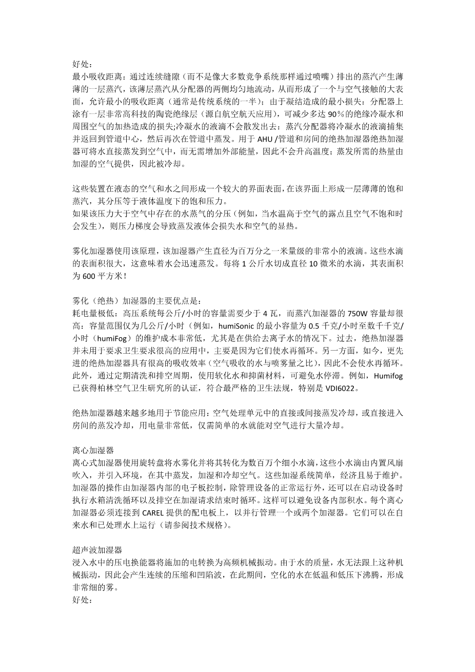 minimum absorption distance: the outlet of steam through continuous slits (rather than through nozzles, as in most of the competing systems) creates a thin layer of steam that flows uniformly from both sides of the distributor, creating a large surface of contact with the air, allowing a minimum absorption distance (typically half the distance of conventional systems);minimum losses due to condensation: the distributors are coated with a layer of very high tech ceramic insulation (deriving from aerospace applications), which reduces by up to 90% the losses due to condensate and the heating of the surrounding air;no emission of droplets of condensate: the steam distributors trap and return any droplets of condensate back to the centre of the pipe, where these evaporate again. Adiabatic humidifiers for AHU/ducts and rooms Adiabatic humidifiers bring about the direct evaporation of water into the air without adding external energy, and therefore without raising the temperature; the heat required f