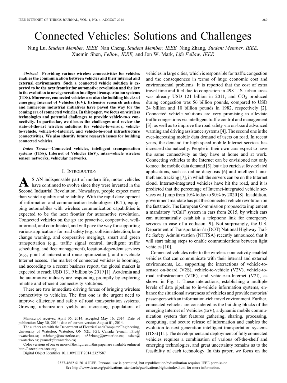 关键字——车辆通信,智能交通系统(ITSs),车联网(IoV)、车辆内部的无线传感器网络、车载网络。