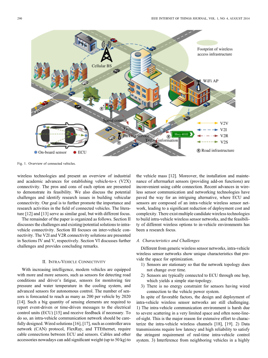 作为现代生活不可或缺的一部分,机动车辆自从在第二次工业革命发明后一直持续发展。如今,人们对汽车的期望不止于它们的质量和可靠性了。随着信息和通信技术(ICT)的快速发展,装备有无线通信功能的汽车有望成为下一个前沿汽车革命。来来去去的连接的汽车的积极性、合作性、消息灵通,和协调性,并且为支持道路安全的各种应用程序铺平道路(例如,碰撞检测、车道变化警告以及合作合并),智能和绿色运输(例如,交通信号控制、智能交通调度,和车队管理)定位服务(例如,目标点和路线选择)和车载互联网接入。汽车通信的市场正在蓬勃发展,并且根据一份最近的业务报告,全球市场预计将在2019年达到1319亿美元[1]。学术界和汽车工业通过探索可靠和高效的连接解决方案来迅速反应。