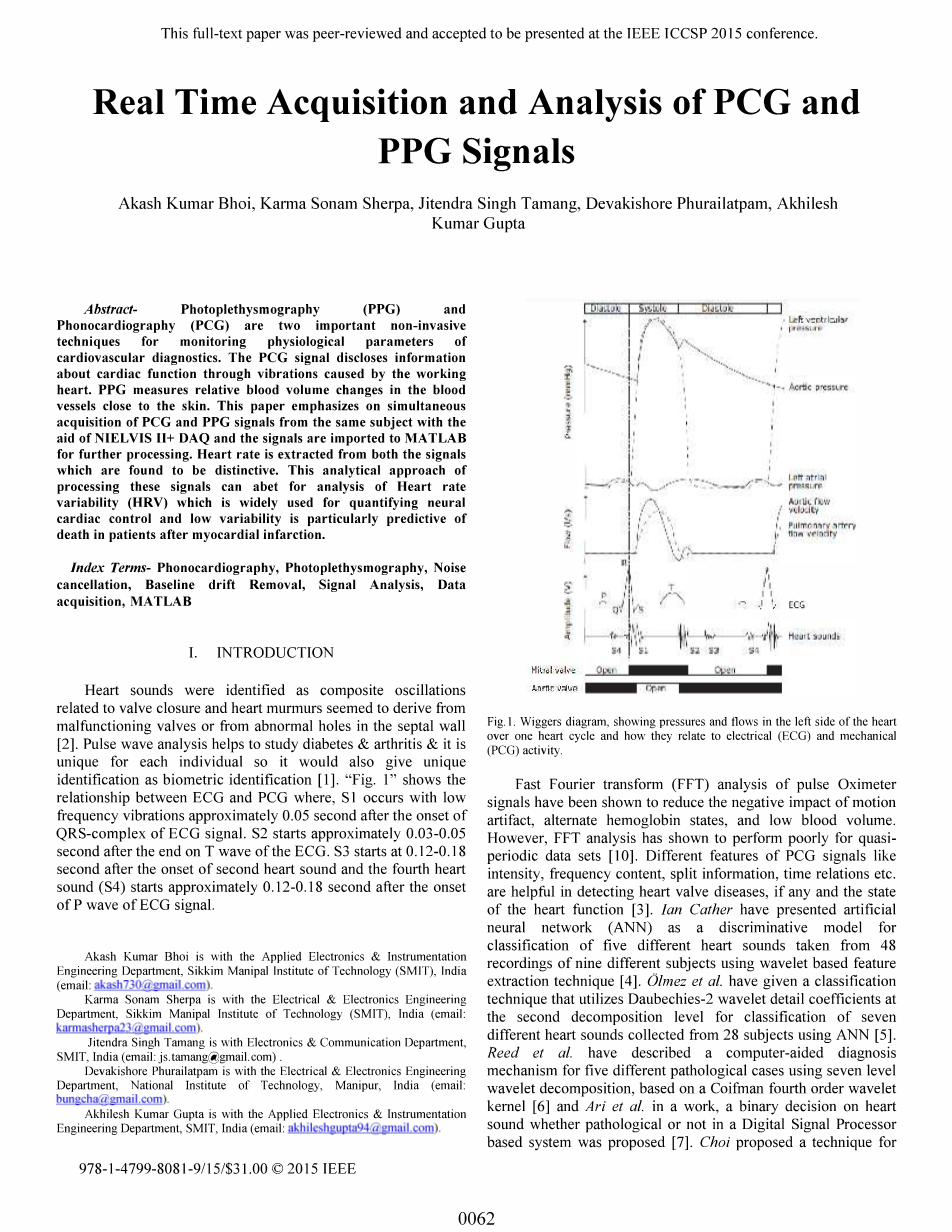 该分析将有助于同时关联PCG和PPG信号的不同特征。此外,这些信号的出现是由心脏功能引起的,并且当进行并发分析时也可以识别诸如时间间隔的基本变化。在这里,我们从年轻健康的受试者获得信号,其心率被发现相似,即90 bpm。MAF和DWT显着地执行预处理工作,即基线漂移消除和噪声消除。进一步的研究涉及这些信号的特征提取和与不同心血管问题相关的相关分析。