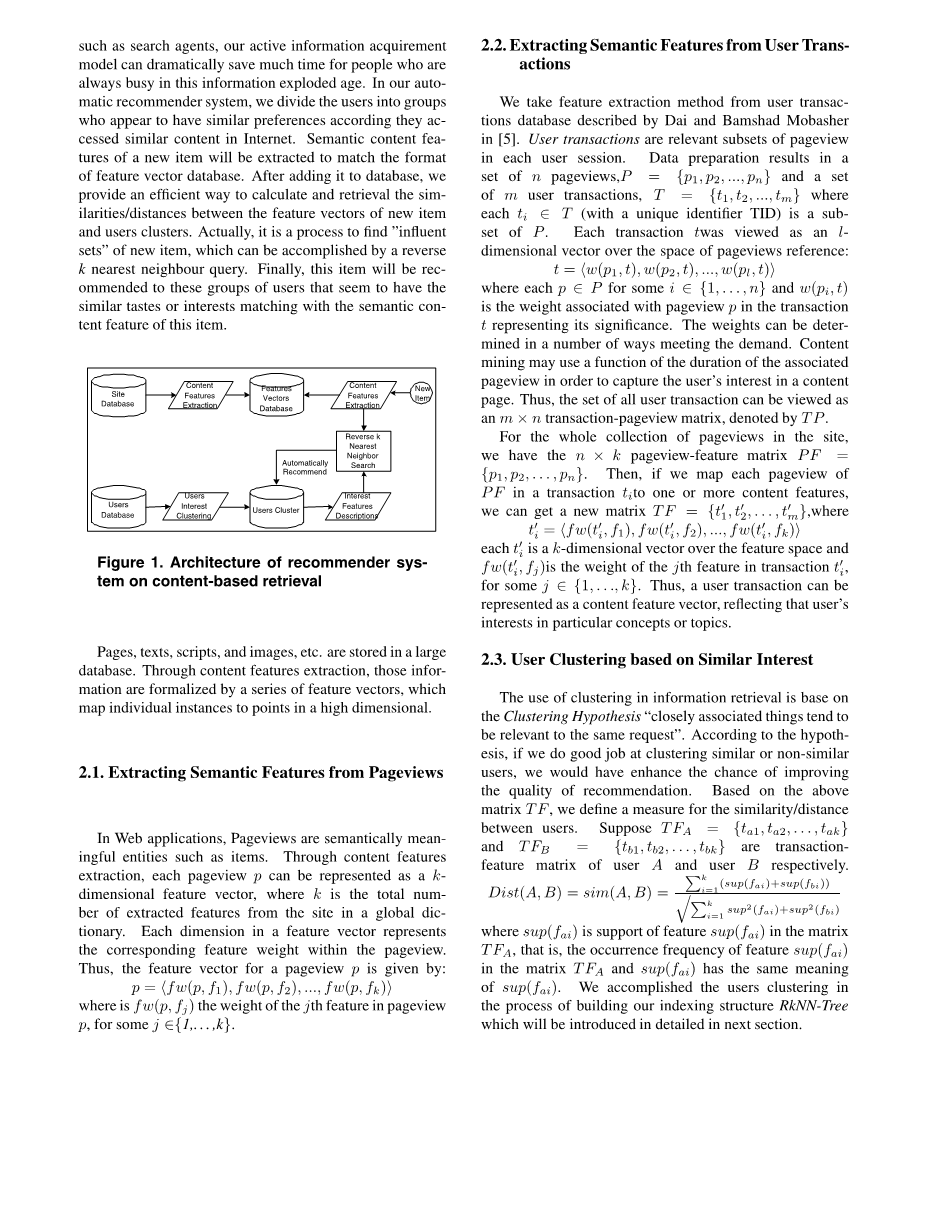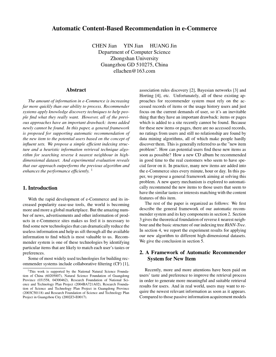 随着电子商务的快速发展及其日益普及的易用工具,世界正变得越来越全球化。但是,电子商务网站上惊人数量的新闻、广告和其他产品信息让我们觉得有必要找到一些新技术,可以大大减少无用信息,帮助我们筛选所有可用信息,找到对我们最有价值的信息。推荐修复系统是这些技术中的一种,通过识别可能符合每个用户口味或偏好的特定项目来筛选最有价值的信息。用于构建推荐系统的一些最广泛使用的技术包括协同过滤(CF)[1],关联规则发现[2],贝叶斯网络[3]和霍廷[4]等。不幸的是,所有这些现有的推荐系统方法都必须依赖于项目的访问记录或用户的使用历史,并且仅仅关注用户的当前需求,因此它们不可避免地具有一个明显的缺点:最近添加到网站的项目或页面无法被找到。因为这些新的项目或页面没有被访问的记录,没有来自用户的评级,数据挖掘算法仍然没有找到关系,这些都使得人们很难发现它们。这通常被称为“新项目问题”。潜在用户如何尽快找到这些新项目?如何及时向那些可能特别喜欢这张专辑的真正顾客推荐这张新专辑?实际上,每一天、每小时甚至每分钟都有许多新项目被添加到电子商务网站中。在这篇文章中,我们提出了一个解决这个问题的总体框架。探索了一种新的查询机制,自动地为那些可能有与该项目的内容特征相匹配的相似品味或兴趣的用户推荐新项目。